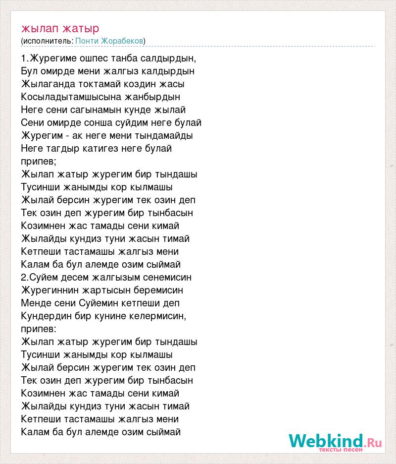 1.Журегиме ошпес танба салдырдын, Бул омирде мени жалгыз калдырдын Жылаганда токтамай коздин жасы Косыладытамшысына жанбырдын Неге сени сагынамын кунде жылай Сени омирде сонша суйдим неге булай Журегим - ак неге мени тындамайды Неге тагдыр катигез неге булай припев; Жылап жатыр журегим бир тындашы Тусинши жанымды кор кылмашы Жылай берсин журегим тек озин деп Тек озин деп журегим бир тынбасын Козимнен жас тамады сени кимай Жылайды кундиз туни жасын тимай Кетпеши тастамашы жалгыз мени Калам ба бул алемде озим сыймай 2.Суйем десем жалгызым сенемисин Журегиннин жартысын беремисин Менде сени Суйемин кетпеши деп Кундердин бир кунине келермисин, припев: Жылап жатыр журегим бир тындашы Тусинши жанымды кор кылмашы Жылай берсин журегим тек озин деп Тек озин деп журегим бир тынбасын Козимнен жас тамады сени кимай Жылайды кундиз туни жасын тимай Кетпеши тастамашы жалгыз мени Калам ба бул алемде озим сыймай