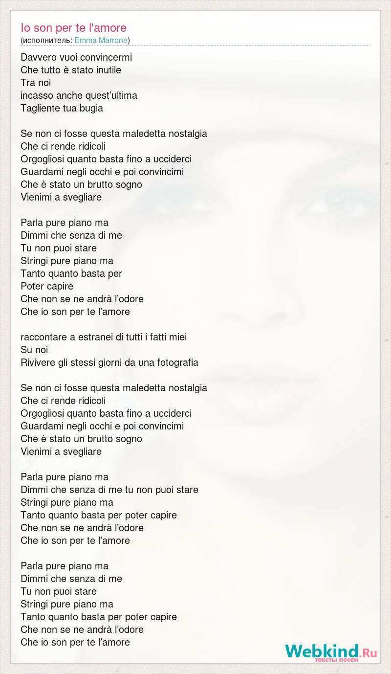 Davvero vuoi convincermi Che tutto è stato inutile Tra noi incasso anche quest’ultima Tagliente tua bugia Se non ci fosse questa maledetta nostalgia Che ci rende ridicoli Orgogliosi quanto basta fino a ucciderci Guardami negli occhi e poi convincimi Che è stato un brutto sogno Vienimi a svegliare Parla pure piano ma Dimmi che senza di me Tu non puoi stare Stringi pure piano ma Tanto quanto basta per Poter capire Che non se ne andrà l’odore Che io son per te l’amore raccontare a estranei di tutti i fatti miei Su noi Rivivere gli stessi giorni da una fotografia Se non ci fosse questa maledetta nostalgia Che ci rende ridicoli Orgogliosi quanto basta fino a ucciderci Guardami negli occhi e poi convincimi Che è stato un brutto sogno Vienimi a svegliare Parla pure piano ma Dimmi che senza di me tu non puoi stare Stringi pure piano ma Tanto quanto basta per poter capire Che non se ne andrà l’odore Che io son per te l’amore Parla pure piano ma Dimmi che senza di me Tu non puoi stare Stringi pure piano ma Tanto quanto basta per poter capire Che non se ne andrà l’odore Che io son per te l’amore
