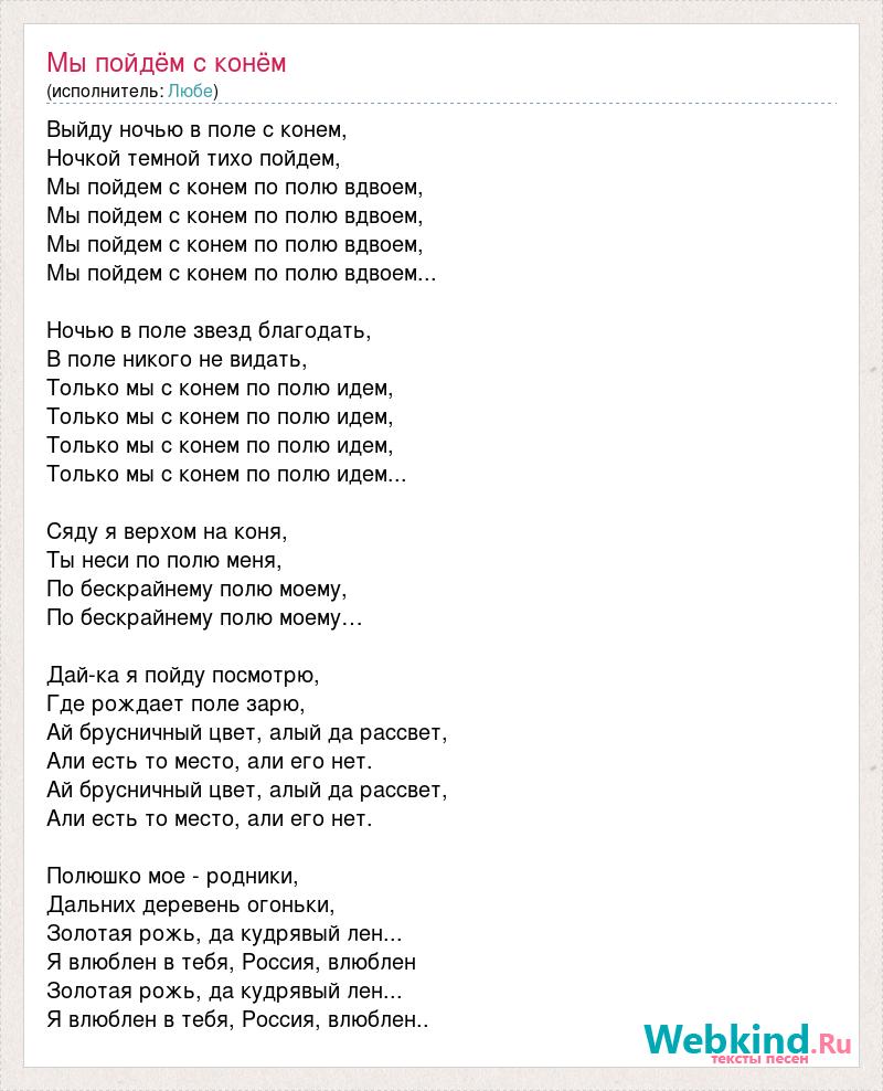 Выйду ночью в поле с конем, Ночкой темной тихо пойдем, Мы пойдем с конем по полю вдвоем, Мы пойдем с конем по полю вдвоем, Мы пойдем с конем по полю вдвоем, Мы пойдем с конем по полю вдвоем... Ночью в поле звезд благодать, В поле никого не видать, Только мы с конем по полю идем, Только мы с конем по полю идем, Только мы с конем по полю идем, Только мы с конем по полю идем... Сяду я верхом на коня, Ты неси по полю меня, По бескрайнему полю моему, По бескрайнему полю моему… Дай-ка я пойду посмотрю, Где рождает поле зарю, Ай брусничный цвет, алый да рассвет, Али есть то место, али его нет. Ай брусничный цвет, алый да рассвет, Али есть то место, али его нет. Полюшко мое - родники, Дальних деревень огоньки, Золотая рожь, да кудрявый лен... Я влюблен в тебя, Россия, влюблен Золотая рожь, да кудрявый лен... Я влюблен в тебя, Россия, влюблен..