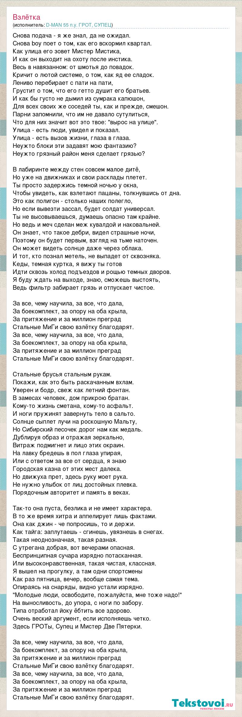Снова подача - я же знал, да не ожидал. Снова boy поет о том, как его вскормил квартал. Как улица его зовет Мистер Мистика, И как он выходит на охоту после инстика. Весь в навязанном: от шмотья до повадок. Кричит о лютой системе, о том, как яд ее сладок. Лениво перебирает с пати на пати, Грустит о том, что его гетто душит его братьев. И как бы густо не дымил из сумрака капюшон, Для всех своих же соседей ты, как и прежде, смешон. Парни запомнили, что им не давало сутулиться, Что для них значит вот это твое: "вырос на улице". Улица - есть люди, увидел и показал. Улица - есть вызов жизни, глаза в глаза. Неужто блоки эти задавят мою фантазию? Неужто грязный район меня сделает грязью? В лабиринте между стен совсем малое дитё, Но уже на движниках и свои расклады плетет. Ты просто задержись темной ночью у окна, Чтобы увидеть, как взлетают пацаны, толкнувшись от дна. Это как полигон - столько наших полегло, Но если вывезти зассал, будет солдат универсал. Ты не высовываешься, думаешь опасно там крайне. Но ведь и меч сделан меж кувалдой и наковальней. Он знает, что такое дебри, видел страшные ночи, Поэтому он будет первым, взгляд на тьме наточен. Он может видеть солнце даже через облака. И тот, кто познал метель, не выпадет от сквозняка. Кеды, темная куртка, я вижу ты готов Идти сквозь холод подъездов и рощью темных дворов. Я буду ждать на выходе, знаю, сможешь выстоять, Ведь фильтр забирает грязь и отпускает чистое. За все, чему научила, за все, что дала, За боекомплект, за опору на оба крыла, За притяжение и за миллион преград Стальные МиГи свою взлётку благодарят. За все, чему научила, за все, что дала, За боекомплект, за опору на оба крыла, За притяжение и за миллион преград Стальные МиГи свою взлётку благодарят. Стальные брусья стальным рукам. Покажи, как это быть раскачанным вхлам. Уверен и бодр, свеж как летний фонтан. В замесах человек, дом прикрою братан. Кому-то жизнь сметана, кому-то асфальт. И ноги пружинят завернуть тело в сальто. Солнце сыплет лучи на роскошную Мальту, Но Сибирский песочек дорог нам как медаль. Дублируя образ и отражая зеркально, Витраж подмигнет и лицо этих окраин. На лавку бредешь в пол глаза упирая, Или с ответом за все от сердца, я знаю Городская казна от этих мест далека. Но движуха прет, здесь руку моет рука. Не нужно улыбок от лиц достойных плевка. Порядочным авторитет и память в веках. Так-то она пуста, безлика и не имеет характера. В то же время хитра и аппелирует лишь фактами. Она как джин - че попросишь, то и держи. Как тайга: заплутаешь - сгинешь, увязнешь в снегах. Такая неоднозначная, такая разная. С утрегана добрая, вот вечерами опасная. Беспринципная сучара изрядно потасканная. Или высоконравственная, такая чистая, классная. Я вышел на прогулку, а там одни спортсмены Как раз пятница, вечер, вообще самая тема. Опираясь на снаряды, видно устали изрядно. "Молодые люди, освободите, пожалуйста, мне тоже надо!" На выносливость, до упора, с ноги по забору. Типа отработал йоку ёбтить все здорово. Очень веский аргумент, если исполняешь четко. Здесь ГРОТы, Супец и Мистер Две Пятерки. За все, чему научила, за все, что дала, За боекомплект, за опору на оба крыла, За притяжение и за миллион преград Стальные МиГи свою взлётку благодарят. За все, чему научила, за все, что дала, За боекомплект, за опору на оба крыла, За притяжение и за миллион преград Стальные МиГи свою взлёт