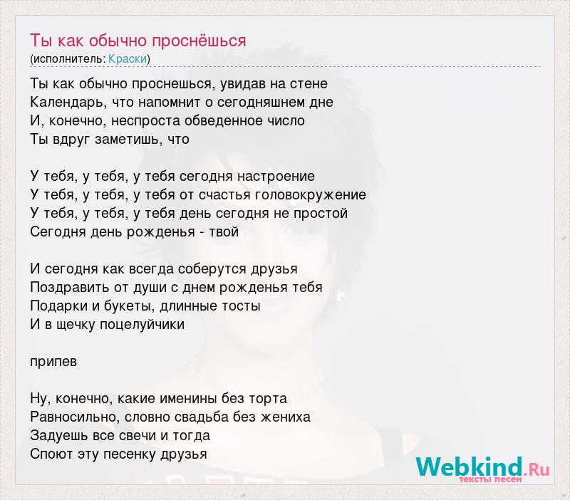 Ты как обычно проснешься, увидав на стене Календарь, что напомнит о сегодняшнем дне И, конечно, неспроста обведенное число Ты вдруг заметишь, что У тебя, у тебя, у тебя сегодня настроение У тебя, у тебя, у тебя от счастья головокружение У тебя, у тебя, у тебя день сегодня не простой Сегодня день рожденья - твой И сегодня как всегда соберутся друзья Поздравить от души с днем рожденья тебя Подарки и букеты, длинные тосты И в щечку поцелуйчики припев Ну, конечно, какие именины без торта Равносильно, словно свадьба без жениха Задуешь все свечи и тогда Споют эту песенку друзья