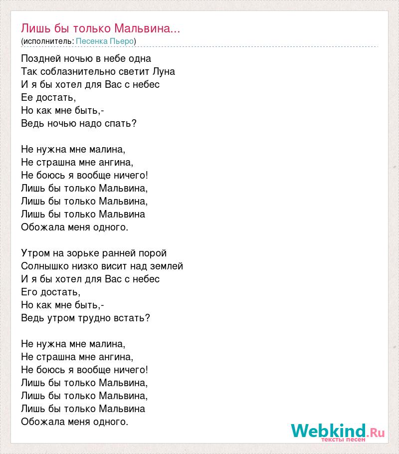 Поздней ночью в небе одна Так соблазнительно светит Луна И я бы хотел для Вас с небес Ее достать, Но как мне быть,- Ведь ночью надо спать? Не нужна мне малина, Не страшна мне ангина, Не боюсь я вообще ничего! Лишь бы только Мальвина, Лишь бы только Мальвина, Лишь бы только Мальвина Обожала меня одного. Утром на зорьке ранней порой Солнышко низко висит над землей И я бы хотел для Вас с небес Его достать, Но как мне быть,- Ведь утром трудно встать? Не нужна мне малина, Не страшна мне ангина, Не боюсь я вообще ничего! Лишь бы только Мальвина, Лишь бы только Мальвина, Лишь бы только Мальвина Обожала меня одного.
