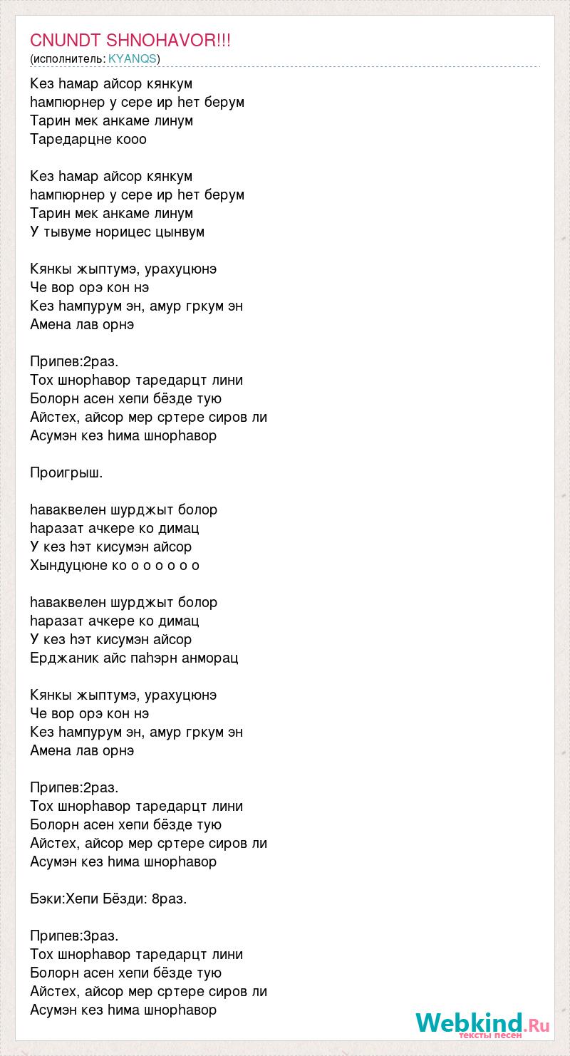 Кез hамар айсор кянкум hампюрнер у сере ир hет берум Тарин мек анкаме линум Таредарцне кооо Кез hамар айсор кянкум hампюрнер у сере ир hет берум Тарин мек анкаме линум У тывуме норицес цынвум Кянкы жыптумэ, урахуцюнэ Че вор орэ кон нэ Кез hампурум эн, амур гркум эн Амена лав орнэ Припев:2раз. Тох шнорhавор таредарцт лини Болорн асен хепи бёзде тую Айстех, айсор мер сртере сиров ли Асумэн кез hима шнорhавор Проигрыш. hаваквелен шурджыт болор hаразат ачкере ко димац У кез hэт кисумэн айсор Хындуцюне ко о о о о о о hаваквелен шурджыт болор hаразат ачкере ко димац У кез hэт кисумэн айсор Ерджаник айс паhэрн анморац Кянкы жыптумэ, урахуцюнэ Че вор орэ кон нэ Кез hампурум эн, амур гркум эн Амена лав орнэ Припев:2раз. Тох шнорhавор таредарцт лини Болорн асен хепи бёзде тую Айстех, айсор мер сртере сиров ли Асумэн кез hима шнорhавор Бэки:Хепи Бёзди: 8раз. Припев:3раз. Тох шнорhавор таредарцт лини Болорн асен хепи бёзде тую Айстех, айсор мер сртере сиров ли Асумэн кез hима шнорhавор