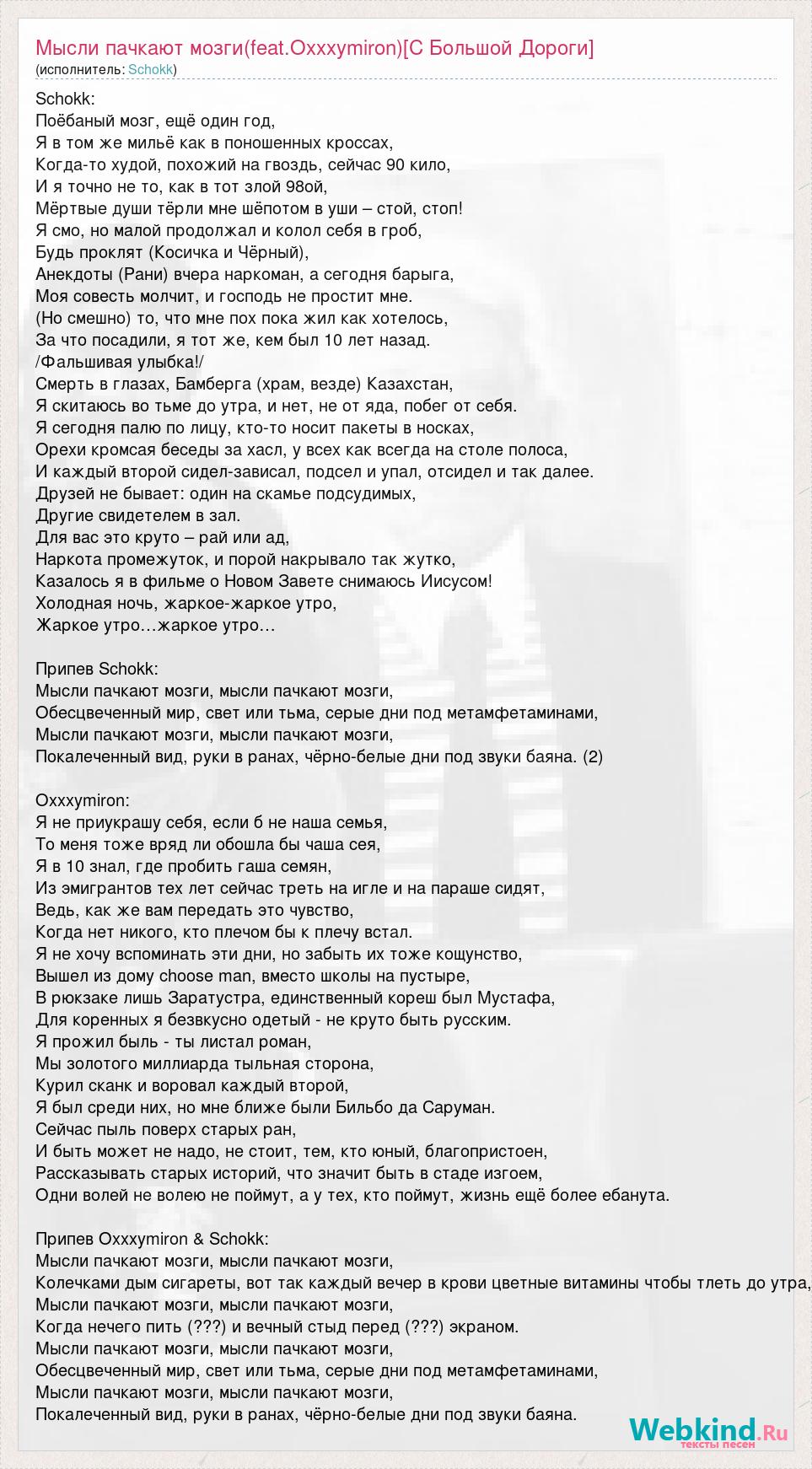 Schokk: Поёбаный мозг, ещё один год, Я в том же мильё как в поношенных кроссах, Когда-то худой, похожий на гвоздь, сейчас 90 кило, И я точно не то, как в тот злой 98ой, Мёртвые души тёрли мне шёпотом в уши – стой, стоп! Я смо, но малой продолжал и колол себя в гроб, Будь проклят (Косичка и Чёрный), Анекдоты (Рани) вчера наркоман, а сегодня барыга, Моя совесть молчит, и господь не простит мне. (Но смешно) то, что мне пох пока жил как хотелось, За что посадили, я тот же, кем был 10 лет назад. /Фальшивая улыбка!/ Смерть в глазах, Бамберга (храм, везде) Казахстан, Я скитаюсь во тьме до утра, и нет, не от яда, побег от себя. Я сегодня палю по лицу, кто-то носит пакеты в носках, Орехи кромсая беседы за хасл, у всех как всегда на столе полоса, И каждый второй сидел-зависал, подсел и упал, отсидел и так далее. Друзей не бывает: один на скамье подсудимых, Другие свидетелем в зал. Для вас это круто – рай или ад, Наркота промежуток, и порой накрывало так жутко, Казалось я в фильме о Новом Завете снимаюсь Иисусом! Холодная ночь, жаркое-жаркое утро, Жаркое утро…жаркое утро… Припев Schokk: Мысли пачкают мозги, мысли пачкают мозги, Обесцвеченный мир, свет или тьма, серые дни под метамфетаминами, Мысли пачкают мозги, мысли пачкают мозги, Покалеченный вид, руки в ранах, чёрно-белые дни под звуки баяна. (2) Oxxxymiron: Я не приукрашу себя, если б не наша семья, То меня тоже вряд ли обошла бы чаша сея, Я в 10 знал, где пробить гаша семян, Из эмигрантов тех лет сейчас треть на игле и на параше сидят, Ведь, как же вам передать это чувство, Когда нет никого, кто плечом бы к плечу встал. Я не хочу вспоминать эти дни, но забыть их тоже кощунство, Вышел из дому choose man, вместо школы на пустыре, В рюкзаке лишь Заратустра, единственный кореш был Мустафа, Для коренных я безвкусно одетый - не круто быть русским. Я прожил быль - ты листал роман, Мы золотого миллиарда тыльная сторона, Курил сканк и воровал каждый второй, Я был среди них, но мне ближе были Бильбо да Саруман. Сейчас пыль поверх старых ран, И быть может не надо, не стоит, тем, кто юный, благопристоен, Рассказывать старых историй, что значит быть в стаде изгоем, Одни волей не волею не поймут, а у тех, кто поймут, жизнь ещё более ебанута. Припев Oxxxymiron & Schokk: Мысли пачкают мозги, мысли пачкают мозги, Колечками дым сигареты, вот так каждый вечер в крови цветные витамины чтобы тлеть до утра, Мысли пачкают мозги, мысли пачкают мозги, Когда нечего пить (???) и вечный стыд перед (???) экраном. Мысли пачкают мозги, мысли пачкают мозги, Обесцвеченный мир, свет или тьма, серые дни под метамфетаминами, Мысли пачкают мозги, мысли пачкают мозги, Покалеченный вид, руки в ранах, чёрно-белые дни под звуки баяна.