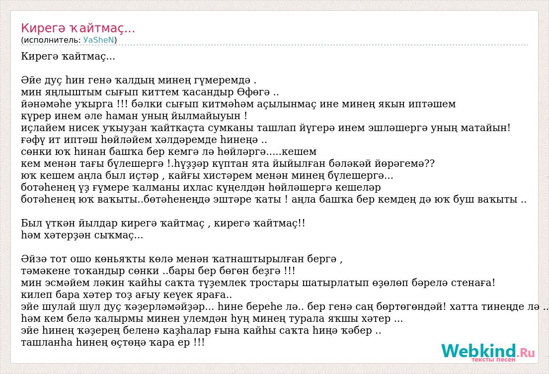 Кирегә ҡайтмаҫ... Әйе дуҫ һин генә ҡалдың минең гүмеремдә . мин яңлыштым сығып киттем ҡасандыр Өфөгә .. йәнәмәһе уҡырга !!! бәлки сығып китмәһәм аҫылынмаҫ ине минең якын иптәшем күрер инем әле һаман уның йылмайыуын ! иҫлайем нисек уҡыуҙан ҡайткаҫта сумканы ташлап йүгерә инем эшләшергә уның матайын! ғәфү ит иптәш һөйләйем хәлдәремде һинеңә .. сөнки юҡ һинан башҡа бер кемгә лә һөйләргә.....кешем кем менән тағы бүлешергә !.һүҙҙәр күптан ята йыйылған бәләкәй йөрәгемә?? юҡ кешем аңла был иҫтәр , кайғы хистәрем менән минең бүлешергә... ботәһенең үҙ ғүмере ҡалманы ихлас күңелдән һөйләшергә кешеләр ботәһенең юҡ ваҡыты..бөтәһенеңдә эштәре ҡаты ! аңла башҡа бер кемдең дә юҡ буш ваҡыты .. Был үткән йылдар кирегә ҡайтмаҫ , кирегә ҡайтмаҫ!! һәм хәтерҙән сыҡмаҫ... Әйзә тот ошо көньяҡты көлә менән ҡатнаштырылған бергә , тәмәкене тоҡандыр сөнки ..бары бер бөгөн беҙгә !!! мин эсмәйем ләкин ҡайһы саҡта түҙемлек тростары шатырлатып өҙөлөп бәрелә стенаға! килеп бара хәтер тоҙ ағыу кеүек яраға.. эйе шулай шул дуҫ ҡәҙерләмәйҙәр... һине береһе лә.. бер генә саң бөртөгөндәй! хатта тинеңде лә .. һәм кем белә ҡалырмы минен улемдән һуң минең турала яҡшы хәтер ... эйе һинең ҡәҙерең беленә каҙһалар ғына кайһы саҡта һиңә ҡәбер .. ташланһа һинең өҫтөңә ҡара ер !!!