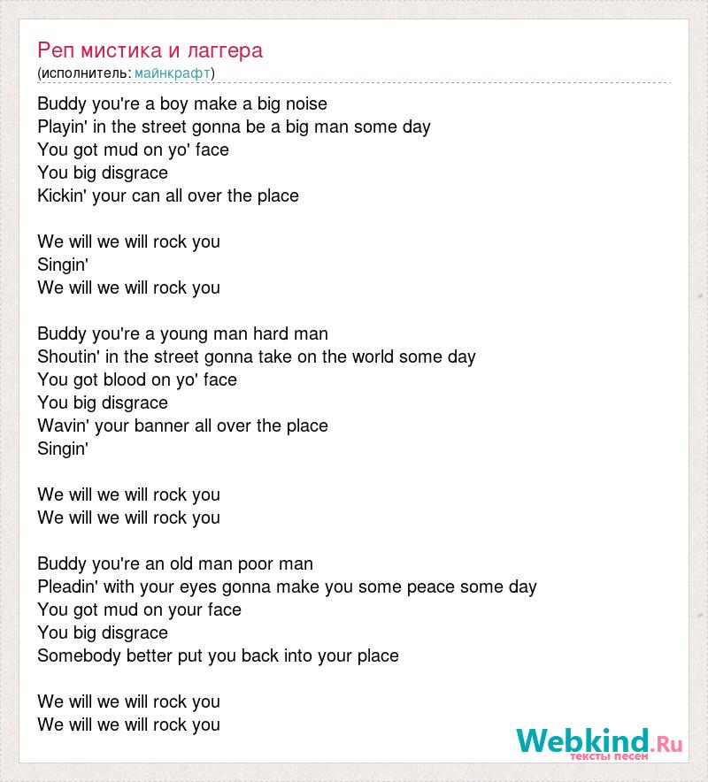 Buddy you're a boy make a big noise Playin' in the street gonna be a big man some day You got mud on yo' face You big disgrace Kickin' your can all over the place We will we will rock you Singin' We will we will rock you Buddy you're a young man hard man Shoutin' in the street gonna take on the world some day You got blood on yo' face You big disgrace Wavin' your banner all over the place Singin' We will we will rock you We will we will rock you Buddy you're an old man poor man Pleadin' with your eyes gonna make you some peace some day You got mud on your face You big disgrace Somebody better put you back into your place We will we will rock you We will we will rock you