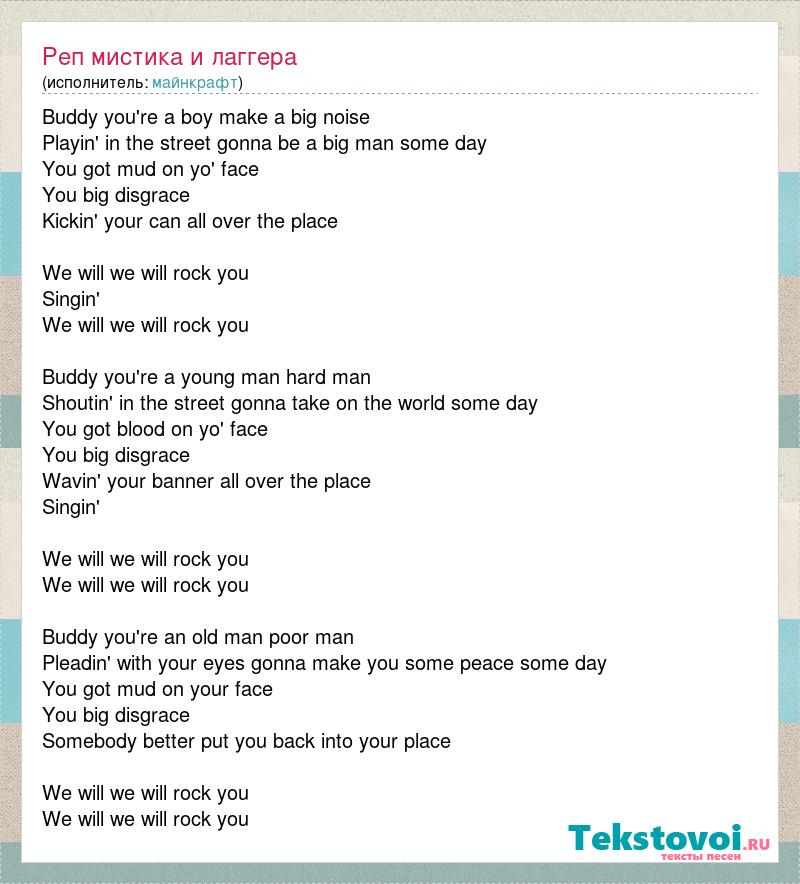 Buddy you're a boy make a big noise Playin' in the street gonna be a big man some day You got mud on yo' face You big disgrace Kickin' your can all over the place We will we will rock you Singin' We will we will rock you Buddy you're a young man hard man Shoutin' in the street gonna take on the world some day You got blood on yo' face You big disgrace Wavin' your banner all over the place Singin' We will we will rock you We will we will rock you Buddy you're an old man poor man Pleadin' with your eyes gonna make you some peace some day You got mud on your face You big disgrace Somebody better put you back into your place We will we will rock you We will we will rock you