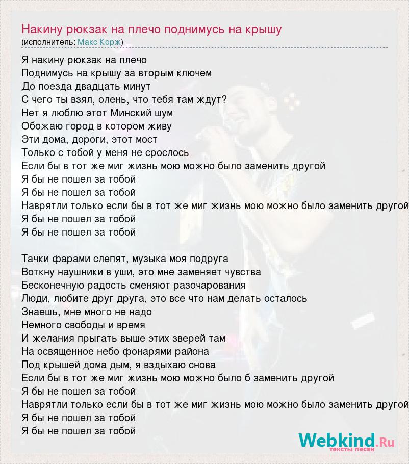 Я накину рюкзак на плечо Поднимусь на крышу за вторым ключем До поезда двадцать минут С чего ты взял, олень, что тебя там ждут? Нет я люблю этот Минский шум Обожаю город в котором живу Эти дома, дороги, этот мост Только с тобой у меня не срослось Если бы в тот же миг жизнь мою можно было заменить другой Я бы не пошел за тобой Я бы не пошел за тобой Наврятли только если бы в тот же миг жизнь мою можно было заменить другой Я бы не пошел за тобой Я бы не пошел за тобой Тачки фарами слепят, музыка моя подруга Воткну наушники в уши, это мне заменяет чувства Бесконечную радость сменяют разочарования Люди, любите друг друга, это все что нам делать осталось Знаешь, мне много не надо Немного свободы и время И желания прыгать выше этих зверей там На освященное небо фонарями района Под крышей дома дым, я вздыхаю снова Если бы в тот же миг жизнь мою можно было б заменить другой Я бы не пошел за тобой Наврятли только если бы в тот же миг жизнь мою можно было заменить другой Я бы не пошел за тобой Я бы не пошел за тобой