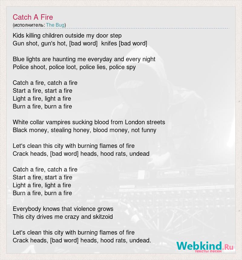 Kids killing children outside my door step Gun shot, gun's hot, [bad word] knifes [bad word] Blue lights are haunting me everyday and every night Police shoot, police loot, police lies, police spy Catch a fire, catch a fire Start a fire, start a fire Light a fire, light a fire Burn a fire, burn a fire White collar vampires sucking blood from London streets Black money, stealing honey, blood money, not funny Let's clean this city with burning flames of fire Crack heads, [bad word] heads, hood rats, undead Catch a fire, catch a fire Start a fire, start a fire Light a fire, light a fire Burn a fire, burn a fire Everybody knows that violence grows This city drives me crazy and skitzoid Let's clean this city with burning flames of fire Crack heads, [bad word] heads, hood rats, undead.