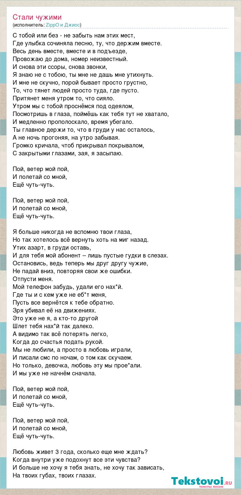 С тобой или без - не забыть нам этих мест, Где улыбка сочиняла песню, ту, что держим вместе. Весь день вместе, вместе и в подъезде, Провожаю до дома, номер неизвестный. И снова эти ссоры, снова звонки, Я знаю не с тобою, ты мне не дашь мне утихнуть. И мне не скучно, порой бывает просто грустно, То, что тянет людей просто туда, где пусто. Притянет меня утром то, что сияло. Утром мы с тобой проснёмся под одеялом, Посмотришь в глаза, поймёшь как тебя тут не хватало, И медленно прополоскало, время убегало. Ты главное держи то, что в груди у нас осталось, А не ночь прогоняя, на утро забывая. Громко кричала, чтоб прикрывал покрывалом, С закрытыми глазами, зая, я засыпаю. Пой, ветер мой пой, И полетай со мной, Ещё чуть-чуть. Пой, ветер мой пой, И полетай со мной, Ещё чуть-чуть. Я больше никогда не вспомню твои глаза, Но так хотелось всё вернуть хоть на миг назад. Утих азарт, в груди оставь, И для тебя мой абонент – лишь пустые гудки в слезах. Остановись, ведь теперь мы друг другу чужие, Не падай вниз, повторяя свои же ошибки. Отпусти меня. Мой телефон забудь, удали его нах*й. Где ты и с кем уже не еб*т меня, Пусть все вернётся к тебе обратно. Зря убивал её на движениях. Это уже не я, а кто-то другой Шлет тебя нах*й так далеко. А видимо так всё потерять легко, Когда до счастья подать рукой. Мы не любили, а просто в любовь играли, И писали смс по ночам, о том как скучаем. Но только, девочка, любовь эту мы прое*али. И мы уже не начнём сначала. Пой, ветер мой пой, И полетай со мной, Ещё чуть-чуть. Пой, ветер мой пой, И полетай со мной, Ещё чуть-чуть. Любовь живет 3 года, сколько еще мне ждать? Когда внутри уже подохнут все эти чувства? И больше не хочу я тебя знать, не хочу так зависать, На твоих губах, твоих глазах.