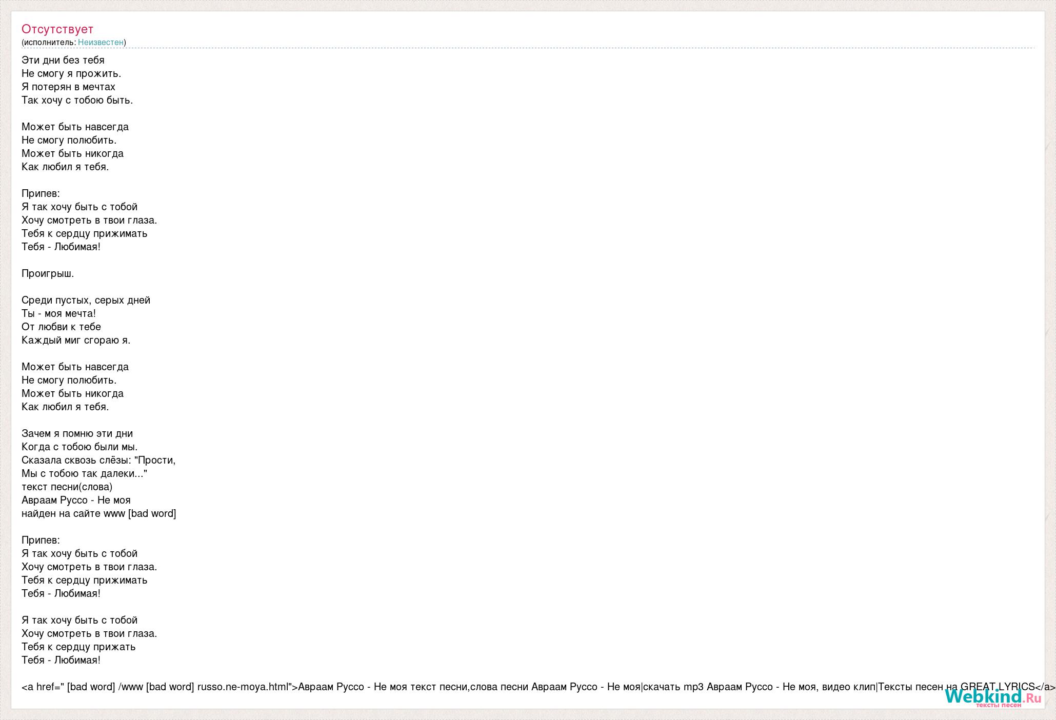 Эти дни без тебя Не смогу я прожить. Я потерян в мечтах Так хочу с тобою быть. Может быть навсегда Не смогу полюбить. Может быть никогда Как любил я тебя. Припев: Я так хочу быть с тобой Хочу смотреть в твои глаза. Тебя к сердцу прижимать Тебя - Любимая! Проигрыш. Среди пустых, серых дней Ты - моя мечта! От любви к тебе Каждый миг сгораю я. Может быть навсегда Не смогу полюбить. Может быть никогда Как любил я тебя. Зачем я помню эти дни Когда с тобою были мы. Сказала сквозь слёзы: "Прости, Мы с тобою так далеки..." текст песни(слова) Авраам Руссо - Не моя найден на сайте www [bad word] Припев: Я так хочу быть с тобой Хочу смотреть в твои глаза. Тебя к сердцу прижимать Тебя - Любимая! Я так хочу быть с тобой Хочу смотреть в твои глаза. Тебя к сердцу прижать Тебя - Любимая! <a href=" [bad word] /www [bad word] russo.ne-moya.html">Авраам Руссо - Не моя текст песни,слова песни Авраам Руссо - Не моя|скачать mp3 Авраам Руссо - Не моя, видео клип|Тексты песен на GREAT LYRICS</a>