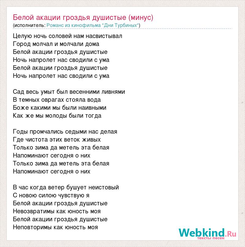 Целую ночь соловей нам насвистывал Город молчал и молчали дома Белой акации гроздья душистые Ночь напролет нас сводили с ума Белой акации гроздья душистые Ночь напролет нас сводили с ума Сад весь умыт был весенними ливнями В темных оврагах стояла вода Боже какими мы были наивными Как же мы молоды были тогда Годы промчались седыми нас делая Где чистота этих веток живых Только зима да метель эта белая Напоминают сегодня о них Только зима да метель эта белая Напоминают сегодня о них В час когда ветер бушует неистовый С новою силою чувствую я Белой акации гроздья душистые Невозвратимы как юность моя Белой акации гроздья душистые Неповторимы как юность моя