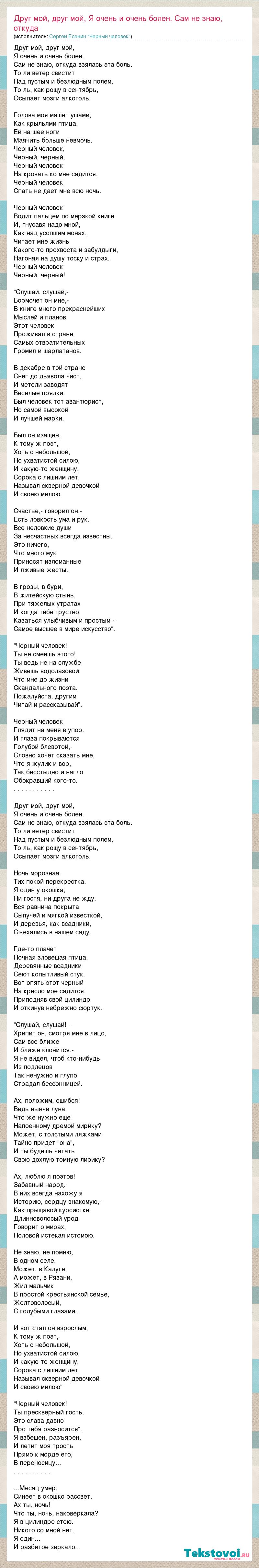 Главная→Исполнители→Сергей Есенин "Черный человек"→Друг мой, друг мой, Я очень и очень болен. Сам не знаю, откуда взялась эт