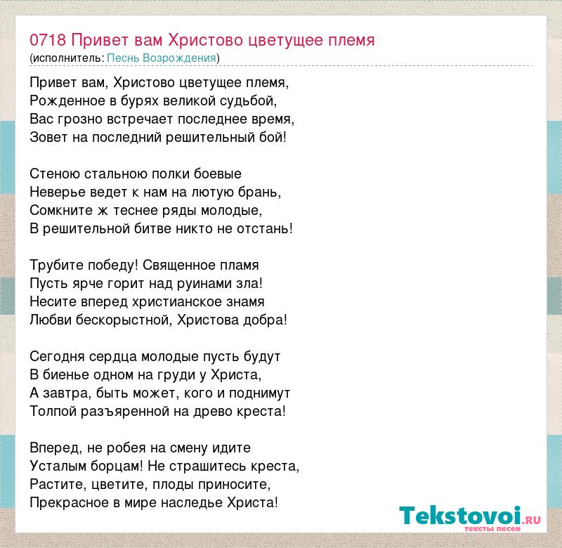 Привет вам, Христово цветущее племя, Рожденное в бурях великой судьбой, Вас грозно встречает последнее время, Зовет на последний решительный бой! Стеною стальною полки боевые Неверье ведет к нам на лютую брань, Сомкните ж теснее ряды молодые, В решительной битве никто не отстань! Трубите победу! Священное пламя Пусть ярче горит над руинами зла! Несите вперед христианское знамя Любви бескорыстной, Христова добра! Сегодня сердца молодые пусть будут В биенье одном на груди у Христа, А завтра, быть может, кого и поднимут Толпой разъяренной на древо креста! Вперед, не робея на смену идите Усталым борцам! Не страшитесь креста, Растите, цветите, плоды приносите, Прекрасное в мире наследье Христа!