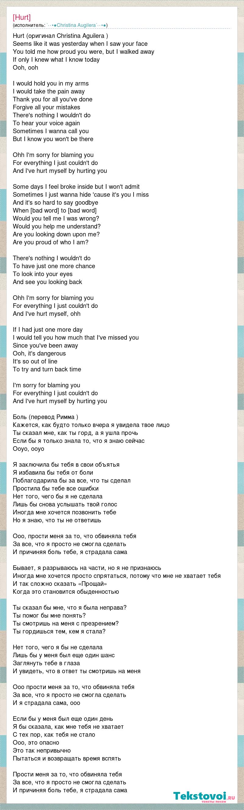 Hurt (оригинал Christina Aguilera ) Seems like it was yesterday when I saw your face You told me how proud you were, but I walked away If only I knew what I know today Ooh, ooh I would hold you in my arms I would take the pain away Thank you for all you've done Forgive all your mistakes There's nothing I wouldn't do To hear your voice again Sometimes I wanna call you But I know you won't be there Ohh I'm sorry for blaming you For everything I just couldn't do And I've hurt myself by hurting you Some days I feel broke inside but I won't admit Sometimes I just wanna hide 'cause it's you I miss And it's so hard to say goodbye When it comes to these rules Would you tell me I was wrong? Would you help me understand? Are you looking down upon me? Are you proud of who I am? There's nothing I wouldn't do To have just one more chance To look into your eyes And see you looking back Ohh I'm sorry for blaming you For everything I just couldn't do And I've hurt myself, ohh If I had just one more day I would tell you how much that I've missed you Since you've been away Ooh, it's dangerous It's so out of line To try and turn back time I'm sorry for blaming you For everything I just couldn't do And I've hurt myself by hurting you Боль (перевод Римма ) Кажется, как будто только вчера я увидела твое лицо Ты сказал мне, как ты горд, а я ушла прочь Если бы я только знала то, что я знаю сейчас Ооyо, ооyо Я заключила бы тебя в свои объятья Я избавила бы тебя от боли Поблагодарила бы за все, что ты сделал Простила бы тебе все ошибки Нет того, чего бы я не сделала Лишь бы снова услышать твой голос Иногда мне хочется позвонить тебе Но я знаю, что ты не ответишь Ооо, прости меня за то, что обвиняла тебя За все, что я просто не смогла сделать И причиняя боль тебе, я страдала сама Бывает, я разрываюсь на части, но я не признаюсь Иногда мне хочется просто спрятаться, потому что мне не хватает тебя И так сложно сказать «Прощай» Когда это становится обыденностью Ты сказал бы мне, что я была неправа? Ты помог бы мне понять? Ты смотришь на меня с презрением? Ты гордишься тем, кем я стала? Нет того, чего я бы не сделала Лишь бы у меня был еще один шанс Заглянуть тебе в глаза И увидеть, что в ответ ты смотришь на меня Ооо прости меня за то, что обвиняла тебя За все, что я просто не смогла сделать И я страдала сама, ооо Если бы у меня был еще один день Я бы сказала, как мне тебя не хватает С тех пор, как тебя не стало Ооо, это опасно Это так непривычно Пытаться и возвращать время вспять Прости меня за то, что обвиняла тебя За все, что я просто не смогла сделать И причиняя боль тебе, я страдала сама