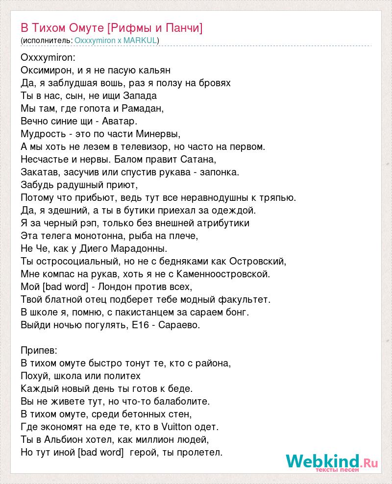 Oxxxymiron: Оксимирон, и я не пасую кальян Да, я заблудшая вошь, раз я ползу на бровях Ты в нас, сын, не ищи Запада Мы там, где гопота и Рамадан, Вечно синие щи - Аватар. Мудрость - это по части Минервы, А мы хоть не лезем в телевизор, но часто на первом. Несчастье и нервы. Балом правит Сатана, Закатав, засучив или спустив рукава - запонка. Забудь радушный приют, Потому что прибьют, ведь тут все неравнодушны к тряпью. Да, я здешний, а ты в бутики приехал за одеждой. Я за черный рэп, только без внешней атрибутики Эта телега монотонна, рыба на плече, Не Че, как у Диего Марадонны. Ты остросоциальный, но не с бедняками как Островский, Мне компас на рукав, хоть я не с Каменноостровской. Мой [bad word] - Лондон против всех, Твой блатной отец подберет тебе модный факультет. В школе я, помню, с пакистанцем за сараем бонг. Выйди ночью погулять, Е16 - Сараево. Припев: В тихом омуте быстро тонут те, кто с района, Похуй, школа или политех Каждый новый день ты готов к беде. Вы не живете тут, но что-то балаболите. В тихом омуте, среди бетонных стен, Где экономят на еде те, кто в Vuitton одет. Ты в Альбион хотел, как миллион людей, Но тут иной [bad word] герой, ты пролетел.