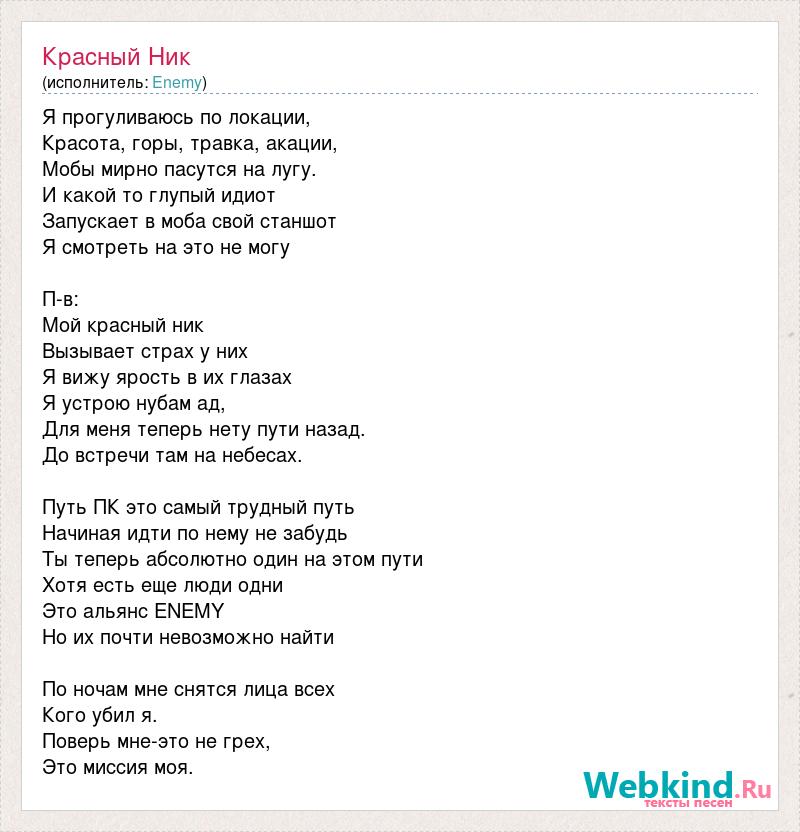 Я прогуливаюсь по локации, Красота, горы, травка, акации, Мобы мирно пасутся на лугу. И какой то глупый идиот Запускает в моба свой станшот Я смотреть на это не могу П-в: Мой красный ник Вызывает страх у них Я вижу ярость в их глазах Я устрою нубам ад, Для меня теперь нету пути назад. До встречи там на небесах. Путь ПК это самый трудный путь Начиная идти по нему не забудь Ты теперь абсолютно один на этом пути Хотя есть еще люди одни Это альянс ENEMY Но их почти невозможно найти По ночам мне снятся лица всех Кого убил я. Поверь мне-это не грех, Это миссия моя.