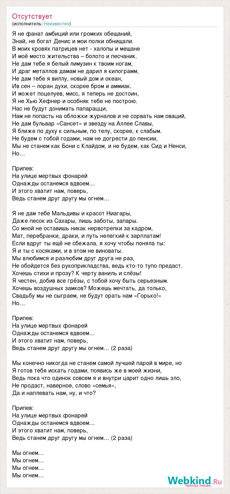 Я не фанат амбиций или громких обещаний, Знай, не богат Денис и мои полки обнищали. В моих кровях патрицев нет - халопы и мещане И моё место жительства – болото и песчаник. Не дам тебе я белый лимузин к твоим ногам, И драг металлов дамам не дарил я килограмм, Не дам тебе я виллу, новый дом и океан, Ив сен – лоран духи, скорее бром и аммиак. И может поцелуев, мисс, я теперь не достоин, Я не Хью Хефнер и особняк тебе не построю. Нас не будут донимать папарацци, Нам не попасть на обложки журналов и не сорвать нам оваций, Не дам бульвар «Сансет» и звезду на Аллее Славы, Я ближе по духу к сильным, по телу, скорее, к слабым. Не будем с тобой годами, нам не догрести до пенсии, Мы не станем как Бони с Клайдом, и не будем, как Сид и Ненси, Но… Припев: На улице мертвых фонарей Однажды останемся вдвоем… И этого хватит нам, поверь, Ведь станем друг другу мы огнем… Я не дам тебе Мальдивы и красот Ниагары, Даже песок из Сахары, лишь заботы, запары. Со мной не оставишь никак нервотрепки за кадром, Мат, перебранки, драки, и путь нелегкий к зарплатам! Если вдруг ты ещё не сбежала, я хочу чтобы поняла ты: Я и ты с косяками, и в этом не виноваты. Мы влюбимся и разлюбим друг друга не раз, Не обойдется без рукоприкладства, ведь кто-то тупо предаст. Хочешь стихи и прозу? К черту ваниль и слёзы! Я честен, добив все грёзы, с тобой хочу быть серьезным. Хочешь воздушных замков? Можешь мечтать, да только, Свадьбу мы не сыграем, не будут орать нам «Горько!» Но… Припев: На улице мертвых фонарей Однажды останемся вдвоем… И этого хватит нам, поверь, Ведь станем друг другу мы огнем… (2 раза) Мы конечно никогда не станем самой лучшей парой в мире, но Я готов тебя искать годами, появись же в моей жизни, Ведь пока что одинок совсем я и внутри царит одно лишь зло, Не продаст, наверное, слово «семья», Да и наплевать нам, ну, и что? Припев: На улице мертвых фонарей Однажды останемся вдвоем… И этого хватит нам, поверь, Ведь станем друг другу мы огнем… (2 раза) Мы огнем… Мы огнем… Мы огнем… Мы огнем…