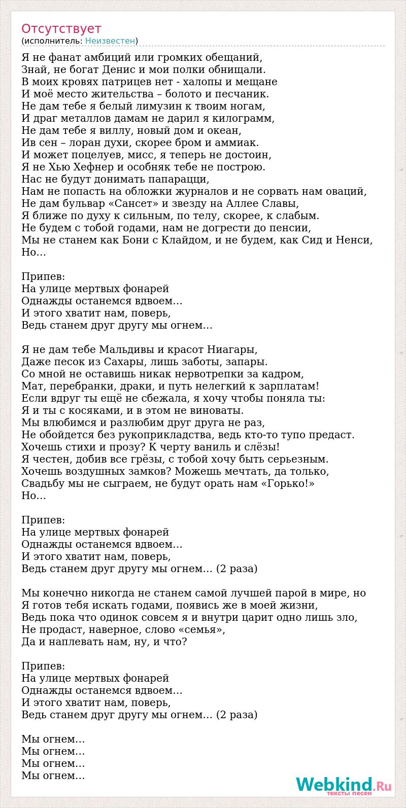 Я не фанат амбиций или громких обещаний, Знай, не богат Денис и мои полки обнищали. В моих кровях патрицев нет - халопы и мещане И моё место жительства – болото и песчаник. Не дам тебе я белый лимузин к твоим ногам, И драг металлов дамам не дарил я килограмм, Не дам тебе я виллу, новый дом и океан, Ив сен – лоран духи, скорее бром и аммиак. И может поцелуев, мисс, я теперь не достоин, Я не Хью Хефнер и особняк тебе не построю. Нас не будут донимать папарацци, Нам не попасть на обложки журналов и не сорвать нам оваций, Не дам бульвар «Сансет» и звезду на Аллее Славы, Я ближе по духу к сильным, по телу, скорее, к слабым. Не будем с тобой годами, нам не догрести до пенсии, Мы не станем как Бони с Клайдом, и не будем, как Сид и Ненси, Но… Припев: На улице мертвых фонарей Однажды останемся вдвоем… И этого хватит нам, поверь, Ведь станем друг другу мы огнем… Я не дам тебе Мальдивы и красот Ниагары, Даже песок из Сахары, лишь заботы, запары. Со мной не оставишь никак нервотрепки за кадром, Мат, перебранки, драки, и путь нелегкий к зарплатам! Если вдруг ты ещё не сбежала, я хочу чтобы поняла ты: Я и ты с косяками, и в этом не виноваты. Мы влюбимся и разлюбим друг друга не раз, Не обойдется без рукоприкладства, ведь кто-то тупо предаст. Хочешь стихи и прозу? К черту ваниль и слёзы! Я честен, добив все грёзы, с тобой хочу быть серьезным. Хочешь воздушных замков? Можешь мечтать, да только, Свадьбу мы не сыграем, не будут орать нам «Горько!» Но… Припев: На улице мертвых фонарей Однажды останемся вдвоем… И этого хватит нам, поверь, Ведь станем друг другу мы огнем… (2 раза) Мы конечно никогда не станем самой лучшей парой в мире, но Я готов тебя искать годами, появись же в моей жизни, Ведь пока что одинок совсем я и внутри царит одно лишь зло, Не продаст, наверное, слово «семья», Да и наплевать нам, ну, и что? Припев: На улице мертвых фонарей Однажды останемся вдвоем… И этого хватит нам, поверь, Ведь станем друг другу мы огнем… (2 раза) Мы огнем… Мы огнем… Мы огнем… Мы огнем…