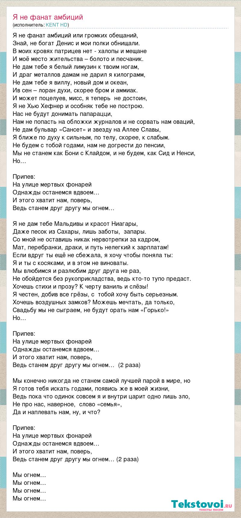 Я не фанат амбиций или громких обещаний, Знай, не богат Денис и мои полки обнищали. В моих кровях патрицев нет - халопы и мещане И моё место жительства – болото и песчаник. Не дам тебе я белый лимузин к твоим ногам, И драг металлов дамам не дарил я килограмм, Не дам тебе я виллу, новый дом и океан, Ив сен – лоран духи, скорее бром и аммиак. И может поцелуев, мисс, я теперь не достоин, Я не Хью Хефнер и особняк тебе не построю. Нас не будут донимать папарацци, Нам не попасть на обложки журналов и не сорвать нам оваций, Не дам бульвар «Сансет» и звезду на Аллее Славы, Я ближе по духу к сильным, по телу, скорее, к слабым. Не будем с тобой годами, нам не догрести до пенсии, Мы не станем как Бони с Клайдом, и не будем, как Сид и Ненси, Но… Припев: На улице мертвых фонарей Однажды останемся вдвоем… И этого хватит нам, поверь, Ведь станем друг другу мы огнем… Я не дам тебе Мальдивы и красот Ниагары, Даже песок из Сахары, лишь заботы, запары. Со мной не оставишь никак нервотрепки за кадром, Мат, перебранки, драки, и путь нелегкий к зарплатам! Если вдруг ты ещё не сбежала, я хочу чтобы поняла ты: Я и ты с косяками, и в этом не виноваты. Мы влюбимся и разлюбим друг друга не раз, Не обойдется без рукоприкладства, ведь кто-то тупо предаст. Хочешь стихи и прозу? К черту ваниль и слёзы! Я честен, добив все грёзы, с тобой хочу быть серьезным. Хочешь воздушных замков? Можешь мечтать, да только, Свадьбу мы не сыграем, не будут орать нам «Горько!» Но… Припев: На улице мертвых фонарей Однажды останемся вдвоем… И этого хватит нам, поверь, Ведь станем друг другу мы огнем… (2 раза) Мы конечно никогда не станем самой лучшей парой в мире, но Я готов тебя искать годами, появись же в моей жизни, Ведь пока что одинок совсем я и внутри царит одно лишь зло, Не про нас, наверное, слово «семья», Да и наплевать нам, ну, и что? Припев: На улице мертвых фонарей Однажды останемся вдвоем… И этого хватит нам, поверь, Ведь станем друг другу мы огнем… (2 раза) Мы огнем… Мы огнем… Мы огнем… Мы огнем…