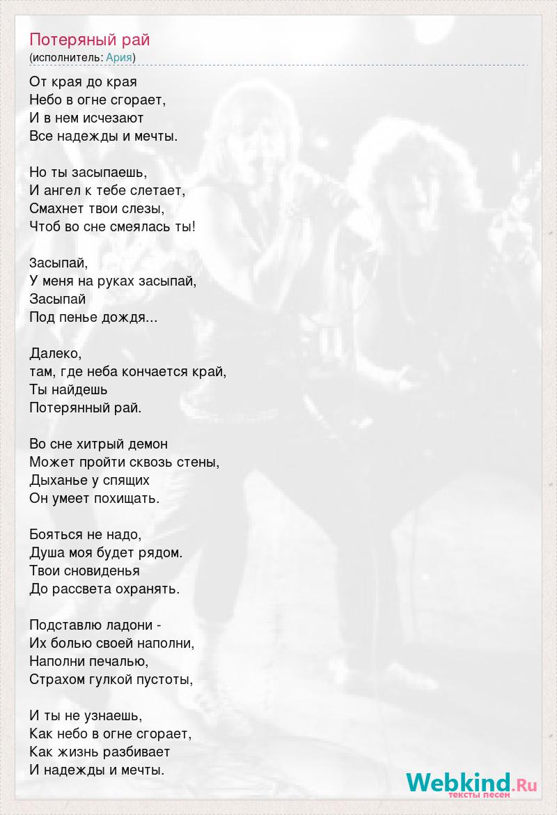 От края до края Небо в огне сгорает, И в нем исчезают Все надежды и мечты. Но ты засыпаешь, И ангел к тебе слетает, Смахнет твои слезы, Чтоб во сне смеялась ты! 3асыпай, У меня на руках засыпай, Засыпай Под пенье дождя... Далеко, там, где неба кончается край, Ты найдешь Потерянный рай. Во сне хитрый демон Может пройти сквозь стены, Дыханье у спящих Он умеет похищать. Бояться не надо, Душа моя будет рядом. Твои сновиденья До рассвета охранять. Подставлю ладони - Их болью своей наполни, Наполни печалью, Страхом гулкой пустоты, И ты не узнаешь, Как небо в огне сгорает, Как жизнь разбивает И надежды и мечты.