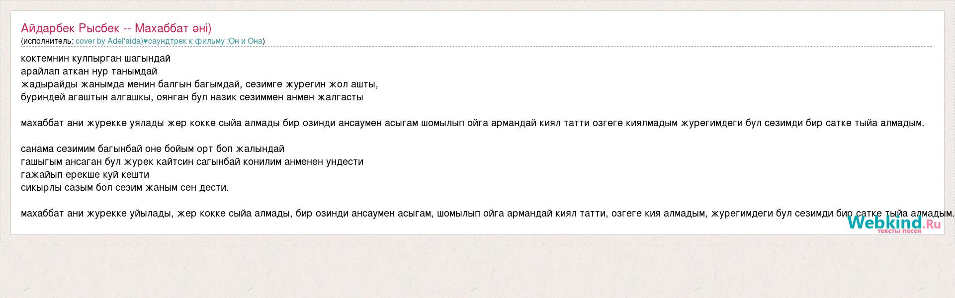 коктемнин кулпырган шагындай арайлап аткан нур танымдай жадырайды жанымда менин балгын багымдай, сезимге журегин жол ашты, буриндей агаштын алгашкы, оянган бул назик сезиммен анмен жалгасты махаббат ани журекке уялады жер кокке сыйа алмады бир озинди ансаумен асыгам шомылып ойга армандай киял татти озгеге киялмадым журегимдеги бул сезимди бир сатке тыйа алмадым. санама сезимим багынбай оне бойым орт боп жалындай гашыгым ансаган бул журек кайтсин сагынбай конилим анменен ундести гажайып ерекше куй кешти сикырлы сазым бол сезим жаным сен дести. махаббат ани журекке уйылады, жер кокке сыйа алмады, бир озинди ансаумен асыгам, шомылып ойга армандай киял татти, озгеге кия алмадым, журегимдеги бул сезимди бир сатке тыйа алмадым.
