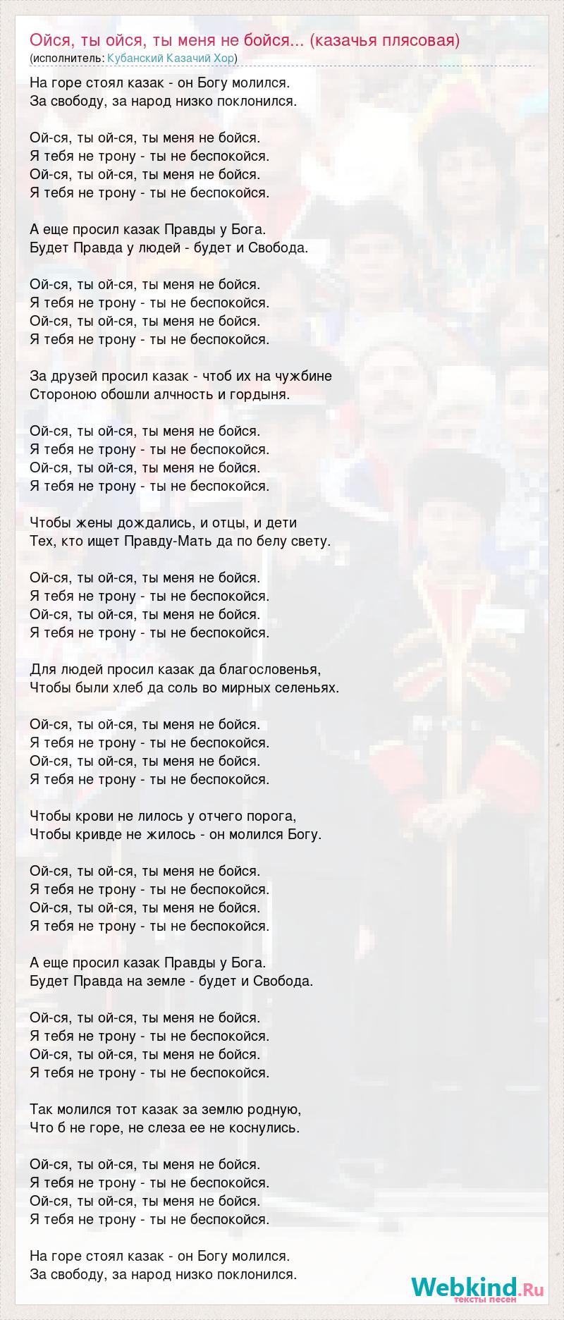 На горе стоял казак - он Богу молился. За свободу, за народ низко поклонился. Ой-ся, ты ой-ся, ты меня не бойся. Я тебя не трону - ты не беспокойся. Ой-ся, ты ой-ся, ты меня не бойся. Я тебя не трону - ты не беспокойся. А еще просил казак Правды у Бога. Будет Правда у людей - будет и Свобода. Ой-ся, ты ой-ся, ты меня не бойся. Я тебя не трону - ты не беспокойся. Ой-ся, ты ой-ся, ты меня не бойся. Я тебя не трону - ты не беспокойся. За друзей просил казак - чтоб их на чужбине Стороною обошли алчность и гордыня. Ой-ся, ты ой-ся, ты меня не бойся. Я тебя не трону - ты не беспокойся. Ой-ся, ты ой-ся, ты меня не бойся. Я тебя не трону - ты не беспокойся. Чтобы жены дождались, и отцы, и дети Тех, кто ищет Правду-Мать да по белу свету. Ой-ся, ты ой-ся, ты меня не бойся. Я тебя не трону - ты не беспокойся. Ой-ся, ты ой-ся, ты меня не бойся. Я тебя не трону - ты не беспокойся. Для людей просил казак да благословенья, Чтобы были хлеб да соль во мирных селеньях. Ой-ся, ты ой-ся, ты меня не бойся. Я тебя не трону - ты не беспокойся. Ой-ся, ты ой-ся, ты меня не бойся. Я тебя не трону - ты не беспокойся. Чтобы крови не лилось у отчего порога, Чтобы кривде не жилось - он молился Богу. Ой-ся, ты ой-ся, ты меня не бойся. Я тебя не трону - ты не беспокойся. Ой-ся, ты ой-ся, ты меня не бойся. Я тебя не трону - ты не беспокойся. А еще просил казак Правды у Бога. Будет Правда на земле - будет и Свобода. Ой-ся, ты ой-ся, ты меня не бойся. Я тебя не трону - ты не беспокойся. Ой-ся, ты ой-ся, ты меня не бойся. Я тебя не трону - ты не беспокойся. Так молился тот казак за землю родную, Что б не горе, не слеза ее не коснулись. Ой-ся, ты ой-ся, ты меня не бойся. Я тебя не трону - ты не беспокойся. Ой-ся, ты ой-ся, ты меня не бойся. Я тебя не трону - ты не беспокойся. На горе стоял казак - он Богу молился. За свободу, за народ низко поклонился.