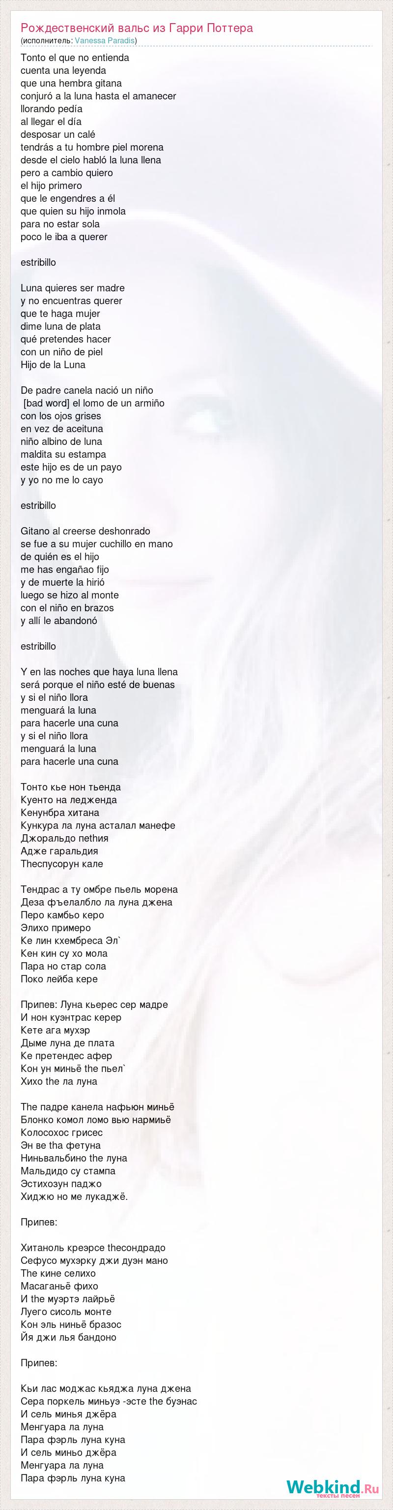 Tonto el que no entienda cuenta una leyenda que una hembra gitana conjuró a la luna hasta el amanecer llorando pedía al llegar el día desposar un calé tendrás a tu hombre piel morena desde el cielo habló la luna llena pero a cambio quiero el hijo primero que le engendres a él que quien su hijo inmola para no estar sola poco le iba a querer estribillo Luna quieres ser madre y no encuentras querer que te haga mujer dime luna de plata qué pretendes hacer con un niño de piel Hijo de la Luna De padre canela nació un niño [bad word] el lomo de un armiño con los ojos grises en vez de aceituna niño albino de luna maldita su estampa este hijo es de un payo y yo no me lo cayo estribillo Gitano al creerse deshonrado se fue a su mujer cuchillo en mano de quién es el hijo me has engañao fijo y de muerte la hirió luego se hizo al monte con el niño en brazos y allí le abandonó estribillo Y en las noches que haya luna llena será porque el niño esté de buenas y si el niño llora menguará la luna para hacerle una cuna y si el niño llora menguará la luna para hacerle una cuna Тонто кье нон тьенда Куенто на ледженда Кенунбра хитана Кункура ла луна асталал манефе Джоральдо пеthия Адже гаральдия Thеспусорун кале Тендрас а ту омбре пьель морена Деза фъелалбло ла луна джена Перо камбьо керо Элихо примеро Ке лин кхембреса Эл` Кен кин су хо мола Пара но стар сола Поко лейба кере Припев: Луна кьерес сер мадре И нон куэнтрас керер Кете ага мухэр Дыме луна де плата Ке претендес афер Кон ун миньё the пьел` Хихо thе ла луна The падре канела нафьюн миньё Блонко комол ломо вью нармиьё Колосохос грисес Эн ве thа фетуна Ниньвальбино thе луна Мальдидо су стампа Эстихозун паджо Хиджю но ме лукаджё. Припев: Хитаноль креэрсе thесондрадо Сефусо мухэрку джи дуэн мано The кине селихо Масаганьё фихо И the муэртэ лайрьё Луего сисоль монте Кон эль ниньё бразос Йя джи лья бандоно Припев: Кьи лас моджас кьяджа луна джена Сера поркель миньуэ -эсте thе буэнас И сель минья джёра Менгуара ла луна Пара фэрль луна куна И сель миньо джёра Менгуара ла луна Пара фэрль луна куна