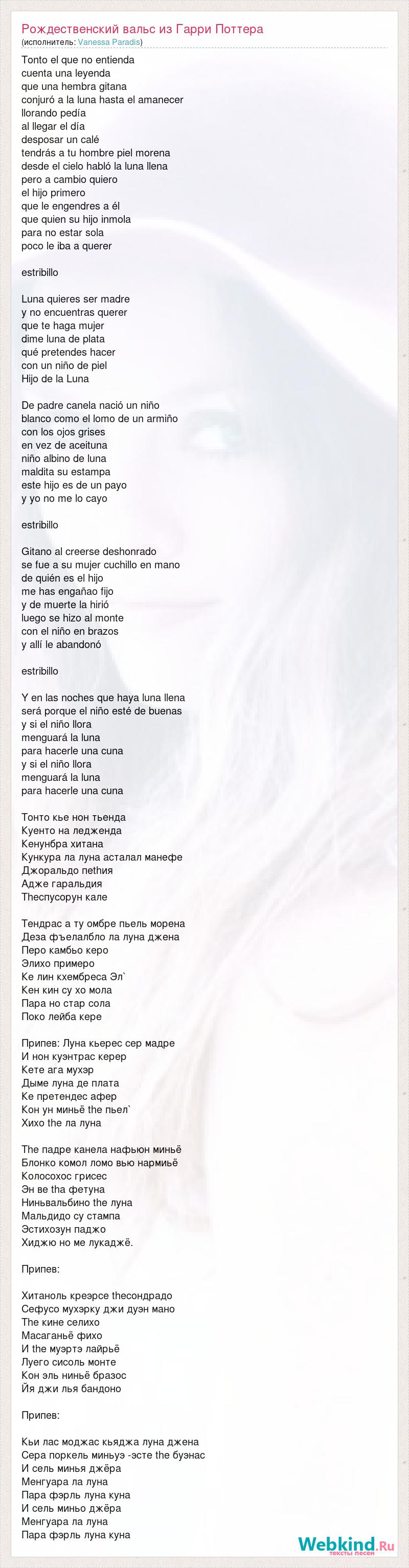 Tonto el que no entienda cuenta una leyenda que una hembra gitana conjuró a la luna hasta el amanecer llorando pedía al llegar el día desposar un calé tendrás a tu hombre piel morena desde el cielo habló la luna llena pero a cambio quiero el hijo primero que le engendres a él que quien su hijo inmola para no estar sola poco le iba a querer estribillo Luna quieres ser madre y no encuentras querer que te haga mujer dime luna de plata qué pretendes hacer con un niño de piel Hijo de la Luna De padre canela nació un niño blanco como el lomo de un armiño con los ojos grises en vez de aceituna niño albino de luna maldita su estampa este hijo es de un payo y yo no me lo cayo estribillo Gitano al creerse deshonrado se fue a su mujer cuchillo en mano de quién es el hijo me has engañao fijo y de muerte la hirió luego se hizo al monte con el niño en brazos y allí le abandonó estribillo Y en las noches que haya luna llena será porque el niño esté de buenas y si el niño llora menguará la luna para hacerle una cuna y si el niño llora menguará la luna para hacerle una cuna Тонто кье нон тьенда Куенто на ледженда Кенунбра хитана Кункура ла луна асталал манефе Джоральдо пеthия Адже гаральдия Thеспусорун кале Тендрас а ту омбре пьель морена Деза фъелалбло ла луна джена Перо камбьо керо Элихо примеро Ке лин кхембреса Эл` Кен кин су хо мола Пара но стар сола Поко лейба кере Припев: Луна кьерес сер мадре И нон куэнтрас керер Кете ага мухэр Дыме луна де плата Ке претендес афер Кон ун миньё the пьел` Хихо thе ла луна The падре канела нафьюн миньё Блонко комол ломо вью нармиьё Колосохос грисес Эн ве thа фетуна Ниньвальбино thе луна Мальдидо су стампа Эстихозун паджо Хиджю но ме лукаджё. Припев: Хитаноль креэрсе thесондрадо Сефусо мухэрку джи дуэн мано The кине селихо Масаганьё фихо И the муэртэ лайрьё Луего сисоль монте Кон эль ниньё бразос Йя джи лья бандоно Припев: Кьи лас моджас кьяджа луна джена Сера поркель миньуэ -эсте thе буэнас И сель минья джёра Менгуара ла луна Пара фэрль луна куна И сель миньо джёра Менгуара ла луна Пара фэрль луна куна