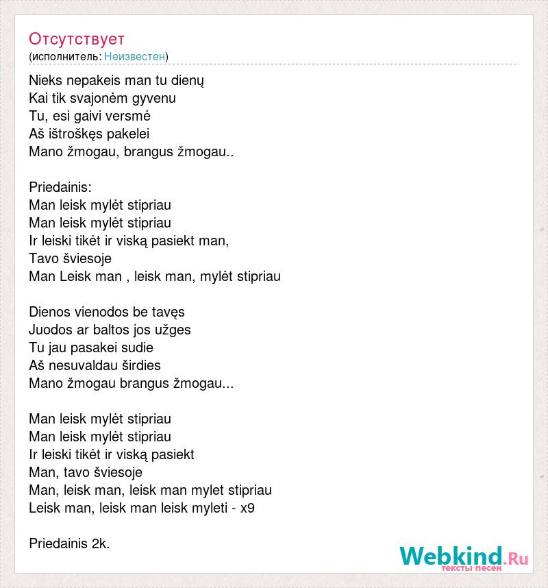 Nieks nepakeis man tu dienų Kai tik svajonėm gyvenu Tu, esi gaivi versmė Aš ištroškęs pakelei Mano žmogau, brangus žmogau.. Priedainis: Man leisk mylėt stipriau Man leisk mylėt stipriau Ir leiski tikėt ir viską pasiekt man, Tavo šviesoje Man Leisk man , leisk man, mylėt stipriau Dienos vienodos be tavęs Juodos ar baltos jos užges Tu jau pasakei sudie Aš nesuvaldau širdies Mano žmogau brangus žmogau... Man leisk mylėt stipriau Man leisk mylėt stipriau Ir leiski tikėt ir viską pasiekt Man, tavo šviesoje Man, leisk man, leisk man mylet stipriau Leisk man, leisk man leisk myleti - x9 Priedainis 2k.