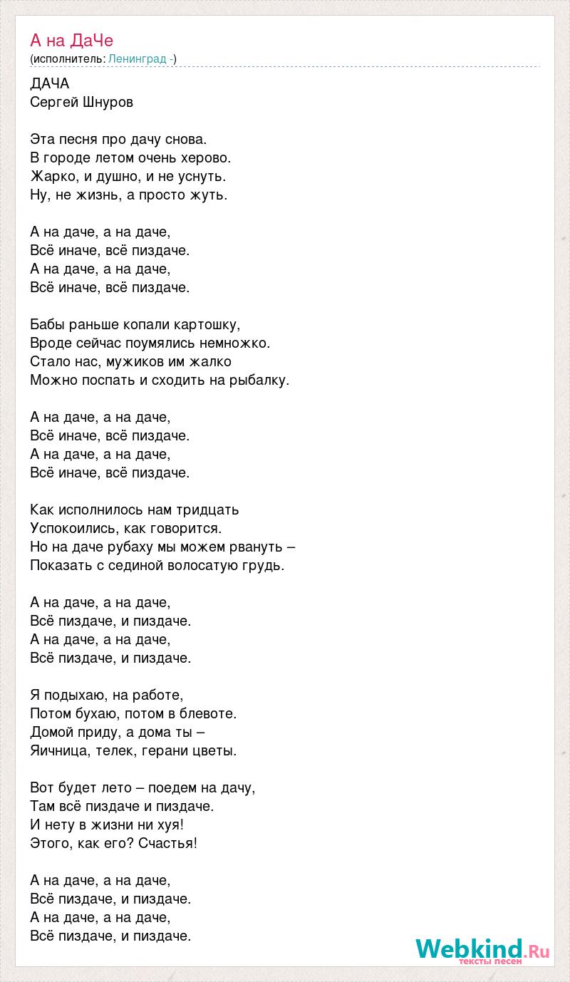 ДАЧА Сергей Шнуров Эта песня про дачу снова. В городе летом очень херово. Жарко, и душно, и не уснуть. Ну, не жизнь, а просто жуть. А на даче, а на даче, Всё иначе, всё пиздаче. А на даче, а на даче, Всё иначе, всё пиздаче. Бабы раньше копали картошку, Вроде сейчас поумялись немножко. Стало нас, мужиков им жалко Можно поспать и сходить на рыбалку. А на даче, а на даче, Всё иначе, всё пиздаче. А на даче, а на даче, Всё иначе, всё пиздаче. Как исполнилось нам тридцать Успокоились, как говорится. Но на даче рубаху мы можем рвануть – Показать с сединой волосатую грудь. А на даче, а на даче, Всё пиздаче, и пиздаче. А на даче, а на даче, Всё пиздаче, и пиздаче. Я подыхаю, на работе, Потом бухаю, потом в блевоте. Домой приду, а дома ты – Яичница, телек, герани цветы. Вот будет лето – поедем на дачу, Там всё пиздаче и пиздаче. И нету в жизни ни хуя! Этого, как его? Счастья! А на даче, а на даче, Всё пиздаче, и пиздаче. А на даче, а на даче, Всё пиздаче, и пиздаче.