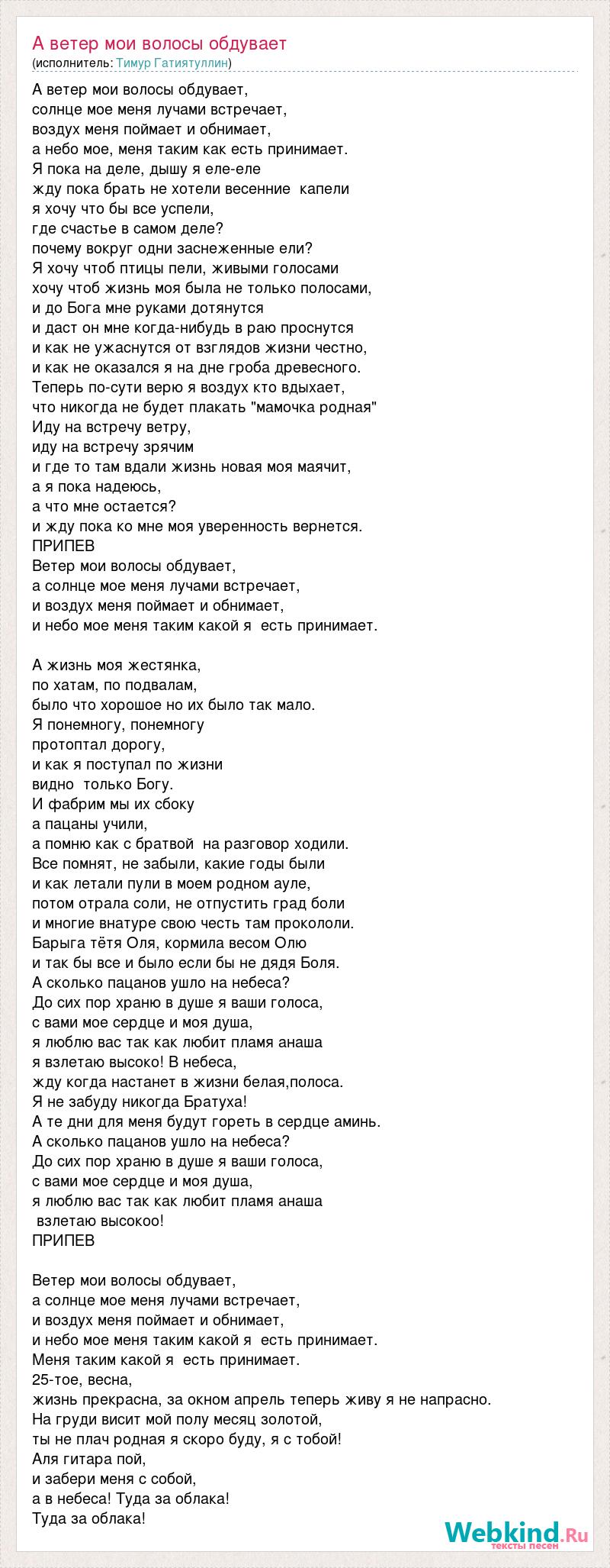 А ветер мои волосы обдувает, солнце мое меня лучами встречает, воздух меня поймает и обнимает, а небо мое, меня таким как есть принимает. Я пока на деле, дышу я еле-еле жду пока брать не хотели весенние капели я хочу что бы все успели, где счастье в самом деле? почему вокруг одни заснеженные ели? Я хочу чтоб птицы пели, живыми голосами хочу чтоб жизнь моя была не только полосами, и до Бога мне руками дотянутся и даст он мне когда-нибудь в раю проснутся и как не ужаснутся от взглядов жизни честно, и как не оказался я на дне гроба древесного. Теперь по-сути верю я воздух кто вдыхает, что никогда не будет плакать "мамочка родная" Иду на встречу ветру, иду на встречу зрячим и где то там вдали жизнь новая моя маячит, а я пока надеюсь, а что мне остается? и жду пока ко мне моя уверенность вернется. ПРИПЕВ Ветер мои волосы обдувает, а солнце мое меня лучами встречает, и воздух меня поймает и обнимает, и небо мое меня таким какой я есть принимает. А жизнь моя жестянка, по хатам, по подвалам, было что хорошое но их было так мало. Я понемногу, понемногу протоптал дорогу, и как я поступал по жизни видно только Богу. И фабрим мы их сбоку а пацаны учили, а помню как с братвой на разговор ходили. Все помнят, не забыли, какие годы были и как летали пули в моем родном ауле, потом отрала соли, не отпустить град боли и многие внатуре свою честь там прокололи. Барыга тётя Оля, кормила весом Олю и так бы все и было если бы не дядя Боля. А сколько пацанов ушло на небеса? До сих пор храню в душе я ваши голоса, с вами мое сердце и моя душа, я люблю вас так как любит пламя анаша я взлетаю высоко! В небеса, жду когда настанет в жизни белая,полоса. Я не забуду никогда Братуха! А те дни для меня будут гореть в сердце аминь. А сколько пацанов ушло на небеса? До сих пор храню в душе я ваши голоса, с вами мое сердце и моя душа, я люблю вас так как любит пламя анаша взлетаю высокоо! ПРИПЕВ Ветер мои волосы обдувает, а солнце мое меня лучами встречает, и воздух меня поймает и обнимает, и небо мое меня таким какой я есть принимает. Меня таким какой я есть принимает. 25-тое, весна, жизнь прекрасна, за окном апрель теперь живу я не напрасно. На груди висит мой полу месяц золотой, ты не плач родная я скоро буду, я с тобой! Аля гитара пой, и забери меня с собой, а в небеса! Туда за облака! Туда за облака!