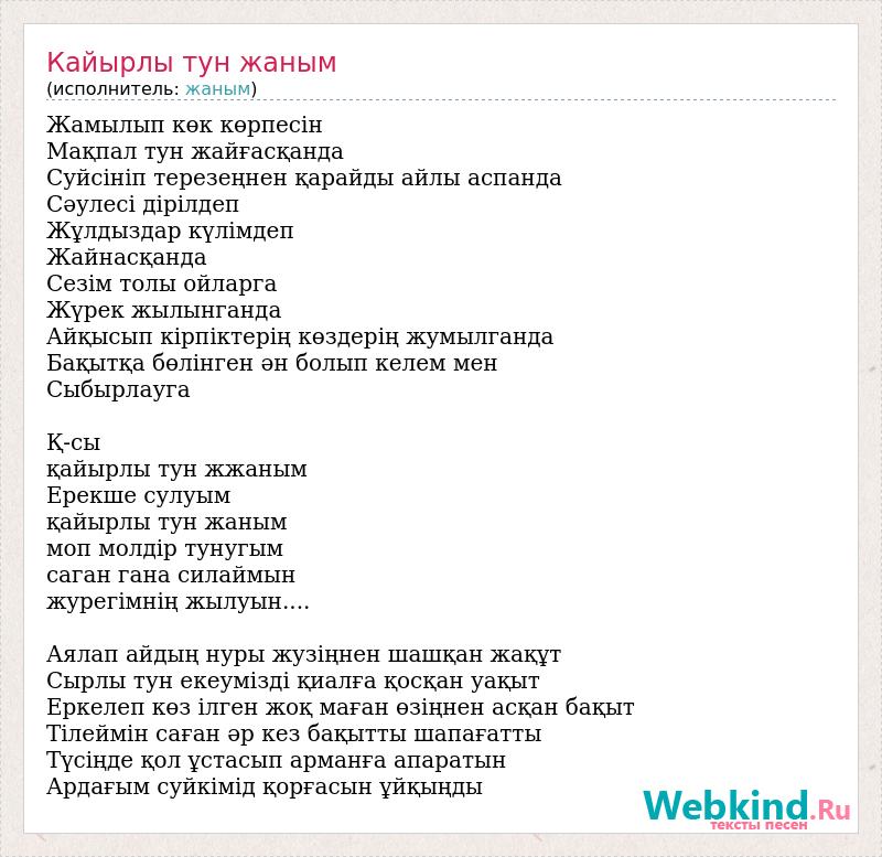 Жамылып көк көрпесін Мақпал тун жайғасқанда Суйсініп терезеңнен қарайды айлы аспанда Сәулесі дірілдеп Жұлдыздар күлімдеп Жайнасқанда Сезім толы ойларга Жүрек жылынганда Айқысып кірпіктерің көздерің жумылганда Бақытқа бөлінген ән болып келем мен Сыбырлауга Қ-сы қайырлы тун жжаным Ерекше сулуым қайырлы тун жаным моп молдір тунугым саган гана силаймын журегімнің жылуын.... Аялап айдың нуры жузіңнен шашқан жақұт Сырлы тун екеумізді қиалға қосқан уақыт Еркелеп көз ілген жоқ маған өзіңнен асқан бақыт Тілеймін саған әр кез бақытты шапағатты Түсіңде қол ұстасып арманға апаратын Ардағым суйкімід қорғасын ұйқыңды