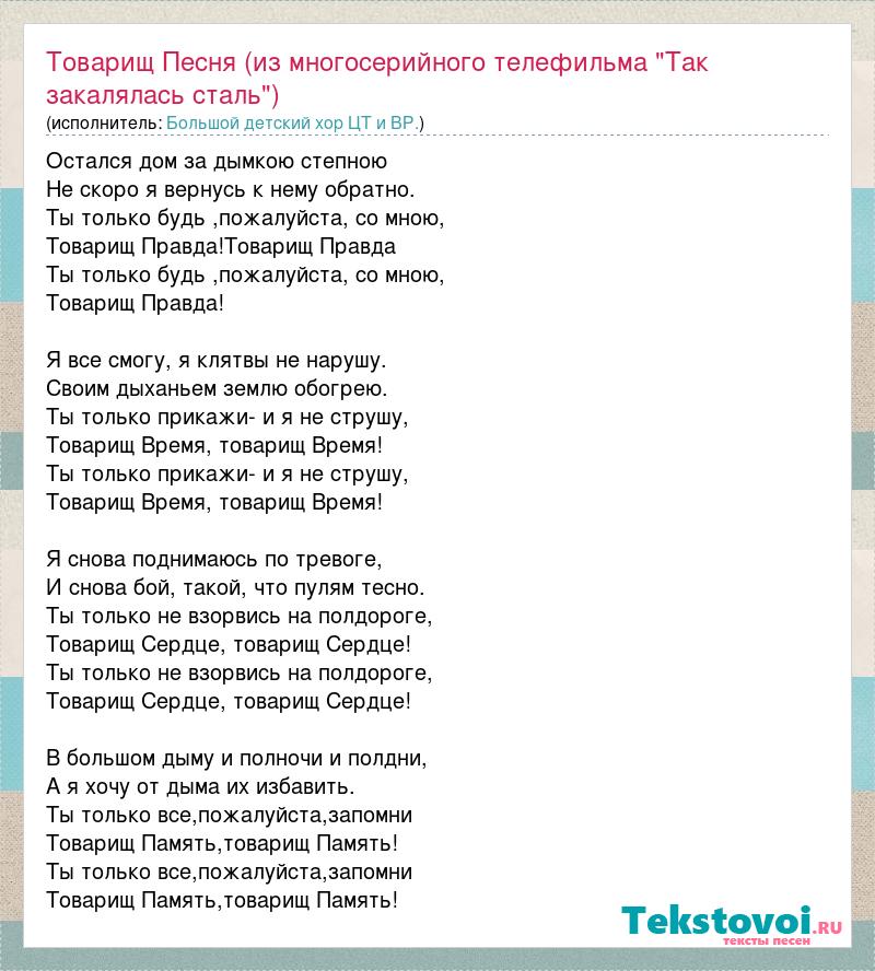 Остался дом за дымкою степною Hе скоро я вернусь к нему обратно. Ты только будь ,пожалуйста, со мнoю, Товарищ Правда!Товарищ Правда Ты только будь ,пожалуйста, со мною, Товарищ Правда! Я все смогу, я клятвы не нарушу. Своим дыханьем землю обогрею. Ты только прикажи- и я не струшу, Товарищ Время, товарищ Время! Ты только прикажи- и я не струшу, Товарищ Время, товарищ Время! Я снова поднимаюсь по тревоге, И снова бой, такой, что пулям тесно. Ты только не взорвись на полдороге, Товарищ Сердце, товарищ Сердце! Ты только не взорвись на полдороге, Товарищ Сердце, товарищ Сердце! В большом дыму и полночи и полдни, А я хочу от дыма их избавить. Ты только все,пожалуйста,запомни Товарищ Память,товарищ Память! Ты только все,пожалуйста,запомни Товарищ Память,товарищ Память!