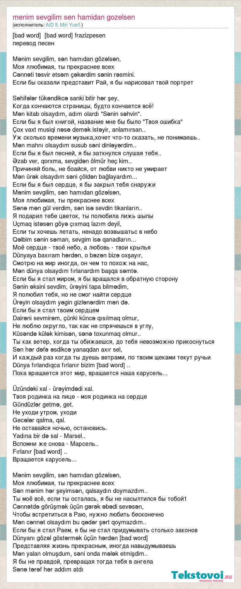 [bad word] [bad word] frazizpesen перевод песен Mənim sevgilim, sən hamıdan gözəlsən, Моя ллюбимая, ты прекраснее всех Cənnəti təsvir etsəm çəkərdim sənin rəsmini. Если бы сказали представит Рай, я бы нарисовал твой портрет Səhifələr tükəndikcə sanki bitir hər şey, Когда кончаются страницы, будто кончается всё! Mən kitab olsaydım, adım olardı "Sənin səhvin". Если бы я был книгой, название мне бы было "Твоя ошибка" Çox vaxt musiqi nəsə demək istəyir, anlamırsan.. Уж сколько времени музыка,хочет что-то сказать, не понимаешь.. Mən mahnı olsaydım susub səni dinləyərdim.. Если бы я был песней, я бы заткнулся слушая тебя.. Əzab ver, qorxma, sevgidən ölmür heç kim.. Причиняй боль, не боайся, от любви никто не умирает Mən ürək olsaydım səni çöldən bağlayardım... Если бы я был сердце, я бы закрыл тебя снаружи Mənim sevgilim, sən hamıdan gözəlsən, Моя ллюбимая, ты прекраснее всех Sənə mən gül verdim, sən isə sevdin tikanların.. Я подарил тебе цветок, ты полюбила лижь шыпы Uçmaq istəsən göyə çıxmaq lazım deyil, Если ты хочешь летать, ненадо возвышатьс в небо Qəlbim sənin səman, sevgim isə qanadların... Моё сердце - твоё небо, а любовь - твои крылья Dünyaya baxıram hərdən, o bəzən bizə oxşayır, Смотрю на мир иногда, он чем то похож на нас, Mən dünya olsaydım fırlanardım başqa səmtə. Если бы я стал миром, я бы вращался в обратную сторону Sənin əksini sevdim, ürəyini tapa bilmədim, Я полюбил тебя, но не смог найти сердце Ürəyin olsaydım yəgin gizlənərdim mən də. Если бы я стал твоим сердцем Dairəni sevmirəm, çünki küncə qısılmaq olmur, Не люблю округло, так как не спрячешься в углу, Küsəndə külək kimisən, sənə toxunmaq olmur.. Ты как ветер, когда ты обижаешся, до тебя невозможно прикоснуться Sən hər dəfə əsdikcə yanaqdan axır sel, И каждый раз когда ты дуешь ветрами, по твоим щеками текут ручьи Dünya fırlandıqca fırlanır bizim [bad word] .. Пока вращается этот мир, вращается наша карусель... Üzündəki xal - ürəyimdədi xal. Твоя родинка на лице - моя родинка на сердце Gündüzlər getmə, get. Не уходи утром, уходи Gecələr qalma, qal. Не оставайся ночью, остановись. Yadına bir də sal - Marsel.. Вспомни же снова - Марсель.. Fırlanır [bad word] .. Вращается карусель... Mənim sevgilim, sən hamıdan gözəlsən, Моя ллюбимая, ты прекраснее всех Sən mənim hər şeyimsən, qalsaydın doymazdım.. Ты моё всё, если ты осталась, я бы не насылтился бы тобой1 Cənnətdə görüşmək üçün gərək əbədi sevəsən, Чтобы встретиться в Раю, нужно любить бесконечно Mən cənnət olsaydım bu qədər şərt qoymazdım.. Если бы я стал Раем, я бы не стал придумывать столько законов Dünyanı gözəl göstərmək üçün hərdən [bad word] Представляя жизнь прекрасным, иногда навыдумываешь Mən yalan olmuşdum, səni onda mələk etmişdim.. Я бы не правдой, превращая тогда тебя в ангела Sənə tərəf hər addım atdı