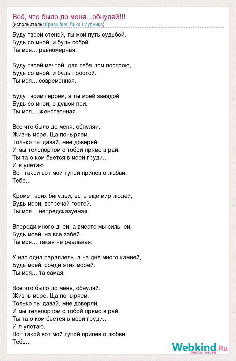 Буду твоей стеной, ты мой путь судьбой, Будь со мной, и будь собой. Ты моя... равномерная. Буду твоей мечтой, для тебя дом построю, Будь со мной, и будь простой. Ты моя... современная. Буду твоим героем, а ты моей звездой, Будь со мной, с душой пой. Ты моя... женственная. Все что было до меня, обнуляй. Жизнь море. Ща поныряем. Только ты давай, мне доверяй, И мы телепортом с тобой прямо в рай. Ты та о ком бьется в моей груди... И я улетаю. Вот такой вот мой тупой припев о любви. Тебе... Кроме твоих бигудей, есть еще мир людей, Будь моей, встречай гостей. Ты моя... непредсказуемая. Впереди много дней, а вместе мы сильней, Будь моей, на все забей. Ты моя... такая не реальная. У нас одна параллель, а на дне много камней, Будь моей, среди этих морей. Ты моя... та самая. Все что было до меня, обнуляй. Жизнь море. Ща поныряем. Только ты давай, мне доверяй, И мы телепортом с тобой прямо в рай. Ты та о ком бьется в моей груди... И я улетаю. Вот такой вот мой тупой припев о любви. Тебе...