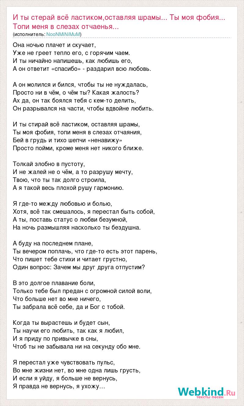 А как ты думаешь, о чем песня "И ты стерай всё ластиком,оставляя шрамы... Ты моя фобия... Топи меня в слез" ?