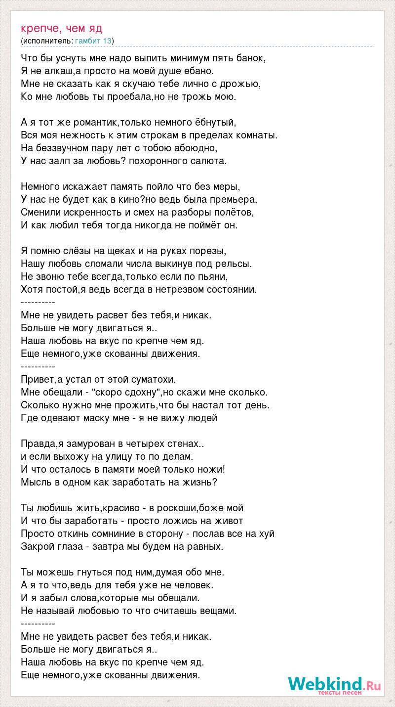 Что бы уснуть мне надо выпить минимум пять банок, Я не алкаш,а просто на моей душе ебано. Мне не сказать как я скучаю тебе лично с дрожью, Ко мне любовь ты проебала,но не трожь мою. А я тот же романтик,только немного ёбнутый, Вся моя нежность к этим строкам в пределах комнаты. На беззвучном пару лет с тобою абоюдно, У нас залп за любовь? похоронного салюта. Немного искажает память пойло что без меры, У нас не будет как в кино?но ведь была премьера. Сменили искренность и смех на разборы полётов, И как любил тебя тогда никогда не поймёт он. Я помню слёзы на щеках и на руках порезы, Нашу любовь сломали числа выкинув под рельсы. Не звоню тебе всегда,только если по пьяни, Хотя постой,я ведь всегда в нетрезвом состоянии. ---------- Мне не увидеть расвет без тебя,и никак. Больше не могу двигаться я.. Наша любовь на вкус по крепче чем яд. Еще немного,уже скованны движения. ---------- Привет,а устал от этой суматохи. Мне обещали - "скоро сдохну",но скажи мне сколько. Сколько нужно мне прожить,что бы настал тот день. Где одевают маску мне - я не вижу людей Правда,я замурован в четырех стенах.. и если выхожу на улицу то по делам. И что осталось в памяти моей только ножи! Мысль в одном как заработать на жизнь? Ты любишь жить,красиво - в роскоши,боже мой И что бы заработать - просто ложись на живот Просто откинь сомниние в сторону - послав все на хуй Закрой глаза - завтра мы будем на равных. Ты можешь гнуться под ним,думая обо мне. А я то что,ведь для тебя уже не человек. И я забыл слова,которые мы обещали. Не называй любовью то что считаешь вещами. ---------- Мне не увидеть расвет без тебя,и никак. Больше не могу двигаться я.. Наша любовь на вкус по крепче чем яд. Еще немного,уже скованны движения.