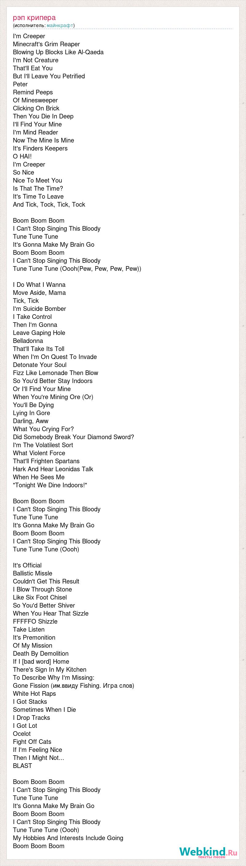 I'm Creeper Minecraft's Grim Reaper Blowing Up Blocks Like Al-Qaeda I'm Not Creature That'll Eat You But I'll Leave You Petrified Peter Remind Peeps Of Minesweeper Clicking On Brick Then You Die In Deep I'll Find Your Mine I'm Mind Reader Now The Mine Is Mine It's Finders Keepers O HAI! I'm Creeper So Nice Nice To Meet You Is That The Time? It's Time To Leave And Tick, Tock, Tick, Tock Boom Boom Boom I Can't Stop Singing This Bloody Tune Tune Tune It's Gonna Make My Brain Go Boom Boom Boom I Can't Stop Singing This Bloody Tune Tune Tune (Oooh(Pew, Pew, Pew, Pew)) I Do What I Wanna Move Aside, Mama Tick, Tick I'm Suicide Bomber I Take Control Then I'm Gonna Leave Gaping Hole Belladonna That'll Take Its Toll When I'm On Quest To Invade Detonate Your Soul Fizz Like Lemonade Then Blow So You'd Better Stay Indoors Or I'll Find Your Mine When You're Mining Ore (Or) You'll Be Dying Lying In Gore Darling, Aww What You Crying For? Did Somebody Break Your Diamond Sword? I'm The Volatilest Sort What Violent Force That'll Frighten Spartans Hark And Hear Leonidas Talk When He Sees Me "Tonight We Dine Indoors!" Boom Boom Boom I Can't Stop Singing This Bloody Tune Tune Tune It's Gonna Make My Brain Go Boom Boom Boom I Can't Stop Singing This Bloody Tune Tune Tune (Oooh) It's Official Ballistic Missle Couldn't Get This Result I Blow Through Stone Like Six Foot Chisel So You'd Better Shiver When You Hear That Sizzle FFFFFO Shizzle Take Listen It's Premonition Of My Mission Death By Demolition If I [bad word] Home There's Sign In My Kitchen To Describe Why I'm Missing: Gone Fission (им.ввиду Fishing. Игра слов) White Hot Raps I Got Stacks Sometimes When I Die I Drop Tracks I Got Lot Ocelot Fight Off Cats If I'm Feeling Nice Then I Might Not... BLAST Boom Boom Boom I Can't Stop Singing This Bloody Tune Tune Tune It's Gonna Make My Brain Go Boom Boom Boom I Can't Stop Singing This Bloody Tune Tune Tune (Oooh) My Hobbies And Interests Include Going Boom Boom Boom