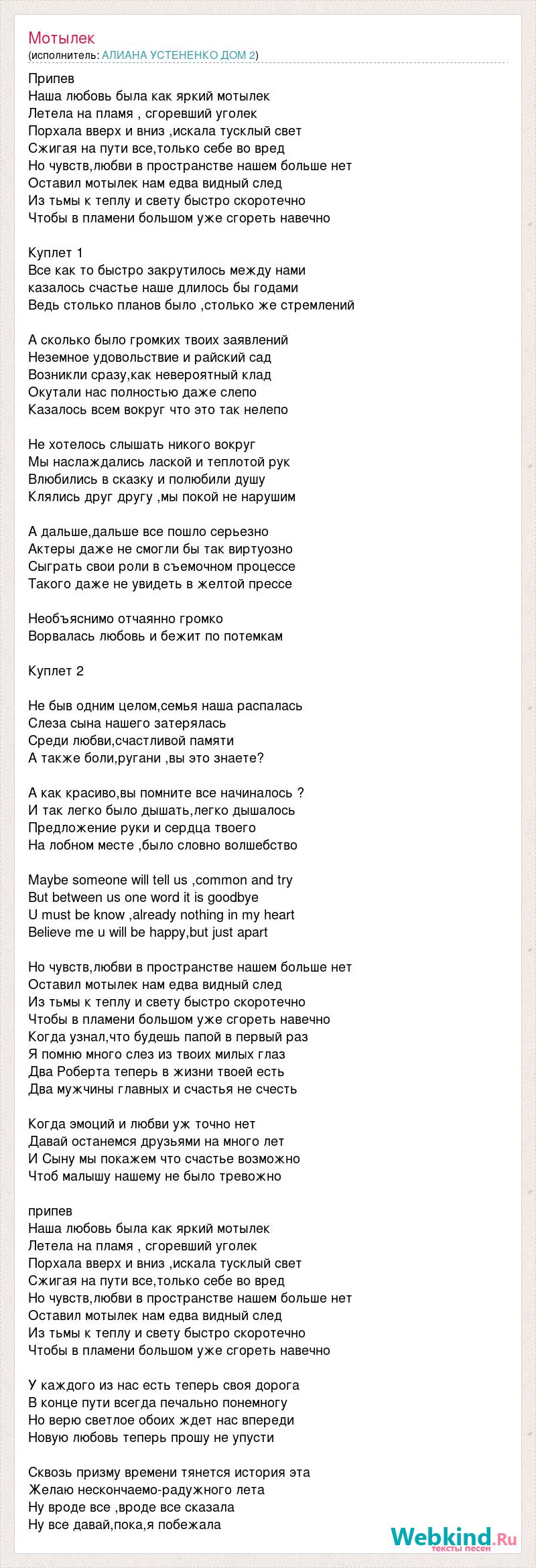 Припев Наша любовь была как яркий мотылек Летела на пламя , сгоревший уголек Порхала вверх и вниз ,искала тусклый свет Сжигая на пути все,только себе во вред Но чувств,любви в пространстве нашем больше нет Оставил мотылек нам едва видный след Из тьмы к теплу и свету быстро скоротечно Чтобы в пламени большом уже сгореть навечно Куплет 1 Все как то быстро закрутилось между нами казалось счастье наше длилось бы годами Ведь столько планов было ,столько же стремлений А сколько было громких твоих заявлений Неземное удовольствие и райский сад Возникли сразу,как невероятный клад Окутали нас полностью даже слепо Казалось всем вокруг что это так нелепо Не хотелось слышать никого вокруг Мы наслаждались лаской и теплотой рук Влюбились в сказку и полюбили душу Клялись друг другу ,мы покой не нарушим А дальше,дальше все пошло серьезно Актеры даже не смогли бы так виртуозно Сыграть свои роли в съемочном процессе Такого даже не увидеть в желтой прессе Необъяснимо отчаянно громко Ворвалась любовь и бежит по потемкам Куплет 2 Не быв одним целом,семья наша распалась Слеза сына нашего затерялась Среди любви,счастливой памяти А также боли,ругани ,вы это знаете? А как красиво,вы помните все начиналось ? И так легко было дышать,легко дышалось Предложение руки и сердца твоего На лобном месте ,было словно волшебство Maybe someone will tell us ,common and try But between us one word it is goodbye U must be know ,already nothing in my heart Believe me u will be happy,but just apart Но чувств,любви в пространстве нашем больше нет Оставил мотылек нам едва видный след Из тьмы к теплу и свету быстро скоротечно Чтобы в пламени большом уже сгореть навечно Когда узнал,что будешь папой в первый раз Я помню много слез из твоих милых глаз Два Роберта теперь в жизни твоей есть Два мужчины главных и счастья не счесть Когда эмоций и любви уж точно нет Давай останемся друзьями на много лет И Сыну мы покажем что счастье возможно Чтоб малышу нашему не было тревожно припев Наша любовь была как яркий мотылек Летела на пламя , сгоревший уголек Порхала вверх и вниз ,искала тусклый свет Сжигая на пути все,только себе во вред Но чувств,любви в пространстве нашем больше нет Оставил мотылек нам едва видный след Из тьмы к теплу и свету быстро скоротечно Чтобы в пламени большом уже сгореть навечно У каждого из нас есть теперь своя дорога В конце пути всегда печально понемногу Но верю светлое обоих ждет нас впереди Новую любовь теперь прошу не упусти Сквозь призму времени тянется история эта Желаю нескончаемо-радужного лета Ну вроде все ,вроде все сказала Ну все давай,пока,я побежала