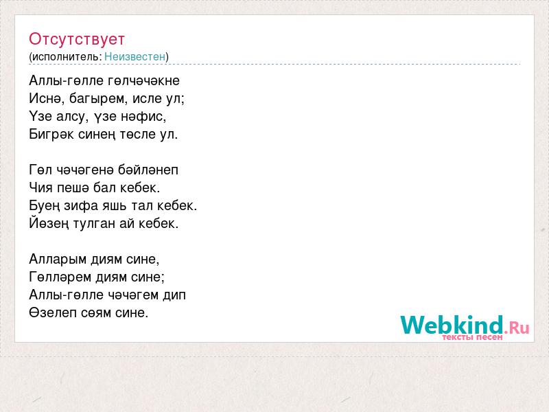 Аллы-гөлле гөлчәчәкне Иснә, багырем, исле ул; Үзе алсу, үзе нәфис, Бигрәк синең төсле ул. Гөл чәчәгенә бәйләнеп Чия пешә бал кебек. Буең зифа яшь тал кебек. Йөзең тулган ай кебек. Алларым диям сине, Гөлләрем диям сине; Аллы-гөлле чәчәгем дип Өзелеп сөям сине.