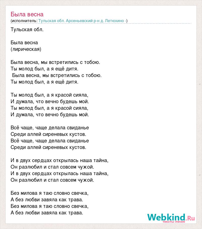 Тульская обл. Была весна (лирическая) Была весна, мы встретились с тобою. Ты молод был, а я ещё дитя. Была весна, мы встретились с тобою. Ты молод был, а я ещё дитя. Ты молод был, а я красой сияла, И думала, что вечно будешь мой. Ты молод был, а я красой сияла, И думала, что вечно будешь мой. Всё чаще, чаще делала свиданье Среди аллей сиреневых кустов. Всё чаще, чаще делала свиданье Среди аллей сиреневых кустов. И в двух сердцах открылась наша тайна, Он разлюбил и стал совсем чужой. И в двух сердцах открылась наша тайна, Он разлюбил и стал совсем чужой. Без милова я таю словно свечка, А без любви завяла как трава. Без милова я таю словно свечка, А без любви завяла как трава.