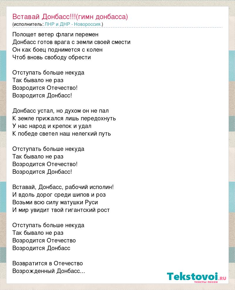 Полощет ветер флаги перемен Донбасс готов врага с земли своей смести Он как боец поднимется с колен Чтоб вновь свободу обрести Отступать больше некуда Так бывало не раз Возродится Отечество! Возродится Донбасс! Донбасс устал, но духом он не пал К земле прижался лишь передохнуть У нас народ и крепок и удал К победе светел наш нелегкий путь Отступать больше некуда Так бывало не раз Возродится Отечество! Возродится Донбасс! Вставай, Донбасс, рабочий исполин! И вдоль дорог среди шипов и роз Возьми всю силу матушки Руси И мир увидит твой гигантский рост Отступать больше некуда Так бывало не раз Возродится Отечество Возродится Донбасс Возвратится в Отечество Возрожденный Донбасс...