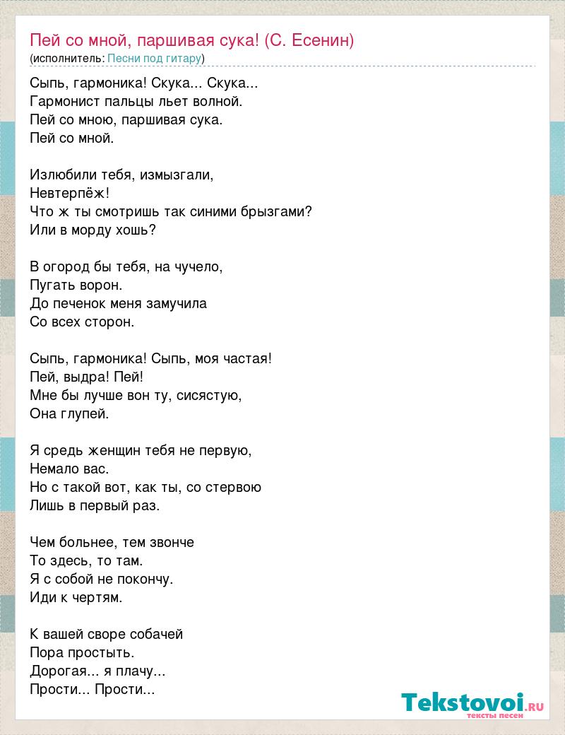 Сыпь, гармоника! Скука... Скука... Гармонист пальцы льет волной. Пей со мною, паршивая сука. Пей со мной. Излюбили тебя, измызгали, Невтерпёж! Что ж ты смотришь так синими брызгами? Или в морду хошь? В огород бы тебя, на чучело, Пугать ворон. До печенок меня замучила Со всех сторон. Сыпь, гармоника! Сыпь, моя частая! Пей, выдра! Пей! Мне бы лучше вон ту, сисястую, Она глупей. Я средь женщин тебя не первую, Немало вас. Но с такой вот, как ты, со стервою Лишь в первый раз. Чем больнее, тем звонче То здесь, то там. Я с собой не покончу. Иди к чертям. К вашей своре собачей Пора простыть. Дорогая... я плачу... Прости... Прости...