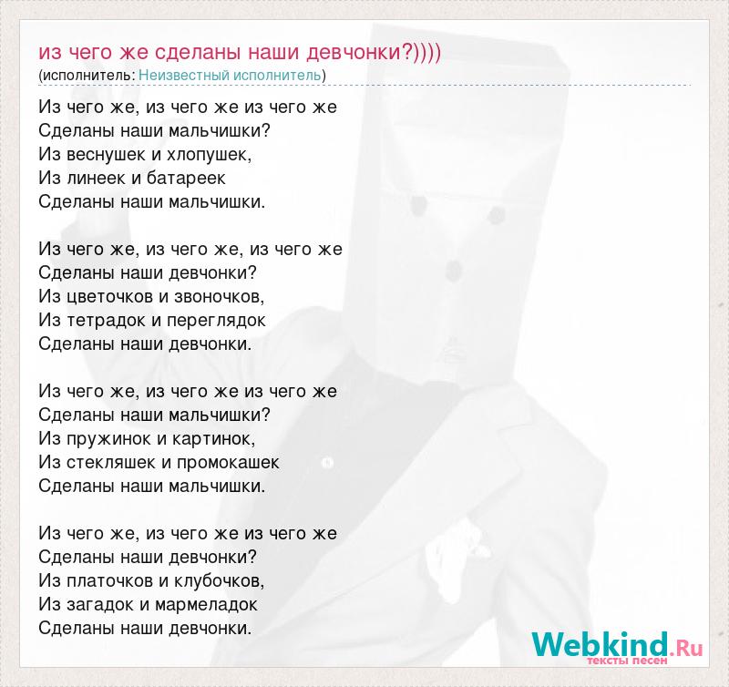 Из чего же, из чего же из чего же Сделаны наши мальчишки? Из веснушек и хлопушек, Из линеек и батареек Сделаны наши мальчишки. Из чего же, из чего же, из чего же Сделаны наши девчонки? Из цветочков и звоночков, Из тетрадок и переглядок Сделаны наши девчонки. Из чего же, из чего же из чего же Сделаны наши мальчишки? Из пружинок и картинок, Из стекляшек и промокашек Сделаны наши мальчишки. Из чего же, из чего же из чего же Сделаны наши девчонки? Из платочков и клубочков, Из загадок и мармеладок Сделаны наши девчонки.