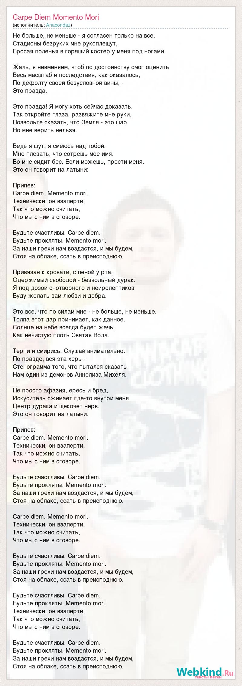 Не больше, не меньше - я согласен только на все. Стадионы безруких мне рукоплещут, Бросая поленья в горящий костер у меня под ногами. Жаль, я невменяем, чтоб по достоинству смог оценить Весь масштаб и последствия, как оказалось, По дефолту своей безусловной вины, - Это правда. Это правда! Я могу хоть сейчас доказать. Так откройте глаза, развяжите мне руки, Позвольте сказать, что Земля - это шар, Но мне верить нельзя. Ведь я шут, я смеюсь над тобой. Мне плевать, что сотрешь мое имя. Во мне сидит бес. Если можешь, прости меня. Это он говорит на латыни: Припев: Carpe diem. Memento mori. Технически, он взаперти, Так что можно считать, Что мы с ним в сговоре. Будьте счастливы. Carpe diem. Будьте прокляты. Memento mori. За наши грехи нам воздастся, и мы будем, Стоя на облаке, ссать в преисподнюю. Привязан к кровати, с пеной у рта, Одержимый свободой - безвольный дурак. Я под дозой снотворного и нейролептиков Буду желать вам любви и добра. Это все, что по силам мне - не больше, не меньше. Толпа этот дар принимает, как данное. Солнце на небе всегда будет жечь, Как нечистую плоть Святая Вода. Терпи и смирись. Слушай внимательно: По правде, вся эта херь - Стенограмма того, что пытался сказать Нам один из демонов Аннелиза Михеля. Не просто афазия, ересь и бред, Искуситель сжимает где-то внутри меня Центр дурака и щекочет нерв. Это он говорит на латыни. Припев: Carpe diem. Memento mori. Технически, он взаперти, Так что можно считать, Что мы с ним в сговоре. Будьте счастливы. Carpe diem. Будьте прокляты. Memento mori. За наши грехи нам воздастся, и мы будем, Стоя на облаке, ссать в преисподнюю. Carpe diem. Memento mori. Технически, он взаперти, Так что можно считать, Что мы с ним в сговоре. Будьте счастливы. Carpe diem. Будьте прокляты. Memento mori. За наши грехи нам воздастся, и мы будем, Стоя на облаке, ссать в преисподнюю. Будьте счастливы. Carpe diem. Будьте прокляты. Memento mori. Технически, он взаперти, Так что можно считать, Что мы с ним в сговоре. Будьте счастливы. Carpe diem. Будьте прокляты. Memento mori. За наши грехи нам воздастся, и мы будем, Стоя на облаке, ссать в преисподнюю.