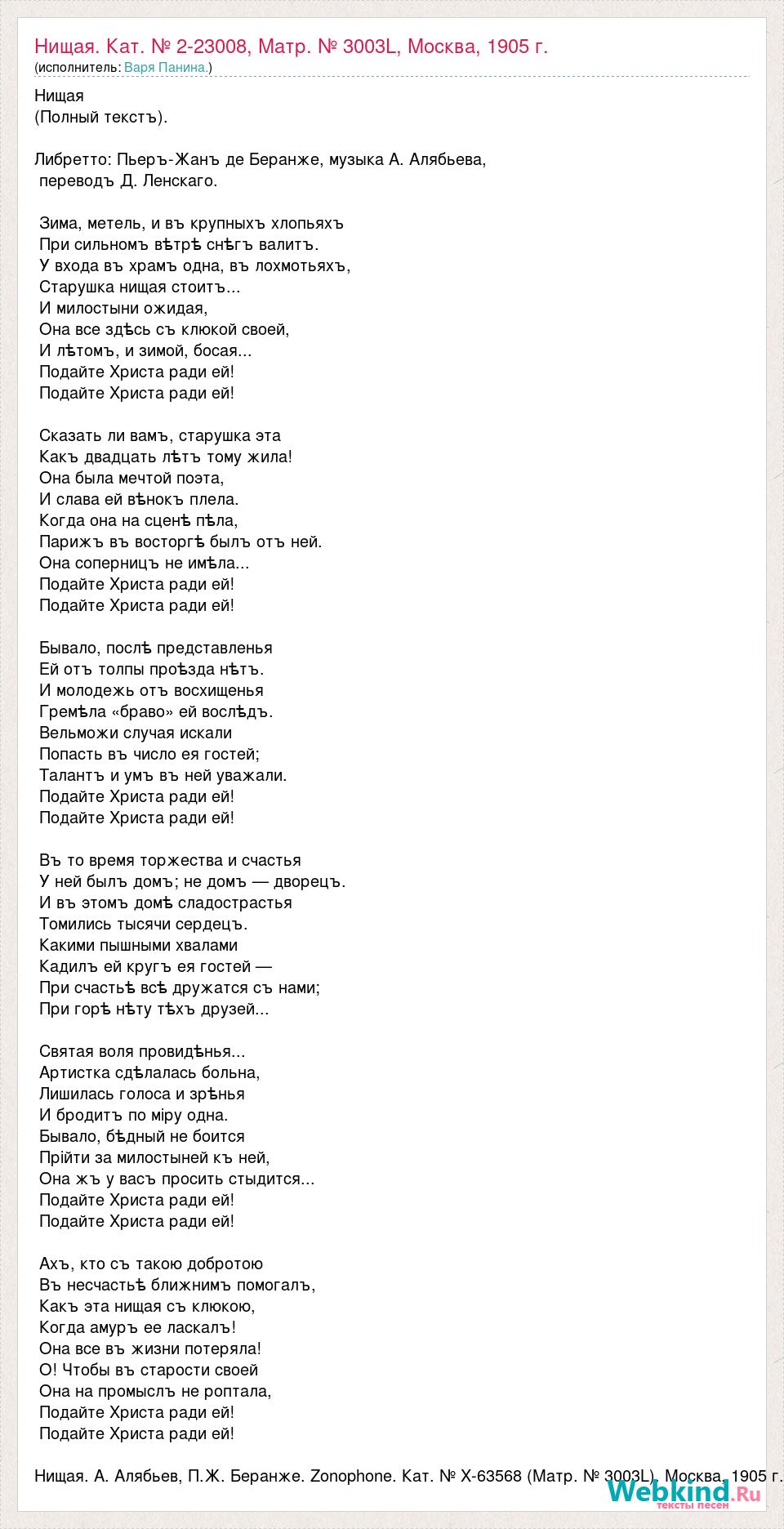 Нищая (Полный текстъ). Либретто: Пьеръ-Жанъ де Беранже, музыка А. Алябьева, переводъ Д. Ленскаго. Зима, метель, и въ крупныхъ хлопьяхъ При сильномъ вѣтрѣ снѣгъ валитъ. У входа въ храмъ одна, въ лохмотьяхъ, Старушка нищая стоитъ... И милостыни ожидая, Она все здѣсь съ клюкой своей, И лѣтомъ, и зимой, босая... Подайте Христа ради ей! Подайте Христа ради ей! Сказать ли вамъ, старушка эта Какъ двадцать лѣтъ тому жила! Она была мечтой поэта, И слава ей вѣнокъ плела. Когда она на сценѣ пѣла, Парижъ въ восторгѣ былъ отъ ней. Она соперницъ не имѣла... Подайте Христа ради ей! Подайте Христа ради ей! Бывало, послѣ представленья Ей отъ толпы проѣзда нѣтъ. И молодежь отъ восхищенья Гремѣла «браво» ей вослѣдъ. Вельможи случая искали Попасть въ число ея гостей; Талантъ и умъ въ ней уважали. Подайте Христа ради ей! Подайте Христа ради ей! Въ то время торжества и счастья У ней былъ домъ; не домъ — дворецъ. И въ этомъ домѣ сладострастья Томились тысячи сердецъ. Какими пышными хвалами Кадилъ ей кругъ ея гостей — При счастьѣ всѣ дружатся съ нами; При горѣ нѣту тѣхъ друзей... Святая воля провидѣнья... Артистка сдѣлалась больна, Лишилась голоса и зрѣнья И бродитъ по міру одна. Бывало, бѣдный не боится Прійти за милостыней къ ней, Она жъ у васъ просить стыдится... Подайте Христа ради ей! Подайте Христа ради ей! Ахъ, кто съ такою добротою Въ несчастьѣ ближнимъ помогалъ, Какъ эта нищая съ клюкою, Когда амуръ ее ласкалъ! Она все въ жизни потеряла! О! Чтобы въ старости своей Она на промыслъ не роптала, Подайте Христа ради ей! Подайте Христа ради ей! Нищая. А. Алябьев, П.Ж. Беранже. Zonophone. Кат. № X-63568 (Матр. № 3003L). Москва, 1905 г.