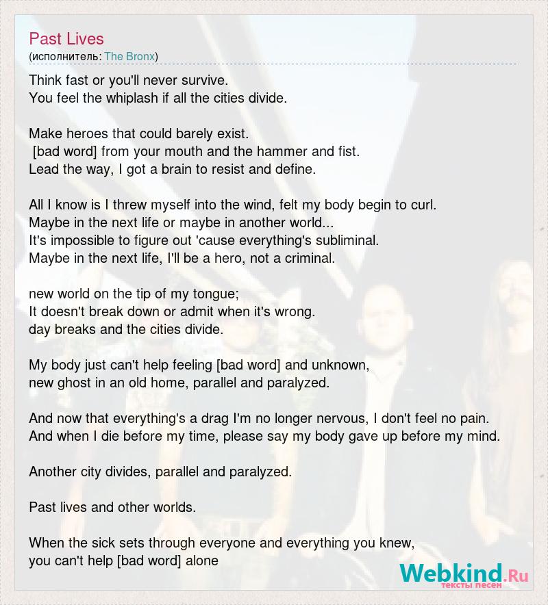 Think fast or you'll never survive. You feel the whiplash if all the cities divide. Make heroes that could barely exist. [bad word] from your mouth and the hammer and fist. Lead the way, I got a brain to resist and define. All I know is I threw myself into the wind, felt my body begin to curl. Maybe in the next life or maybe in another world... It's impossible to figure out 'cause everything's subliminal. Maybe in the next life, I'll be a hero, not a criminal. new world on the tip of my tongue; It doesn't break down or admit when it's wrong. day breaks and the cities divide. My body just can't help feeling [bad word] and unknown, new ghost in an old home, parallel and paralyzed. And now that everything's a drag I'm no longer nervous, I don't feel no pain. And when I die before my time, please say my body gave up before my mind. Another city divides, parallel and paralyzed. Past lives and other worlds. When the sick sets through everyone and everything you knew, you can't help [bad word] alone