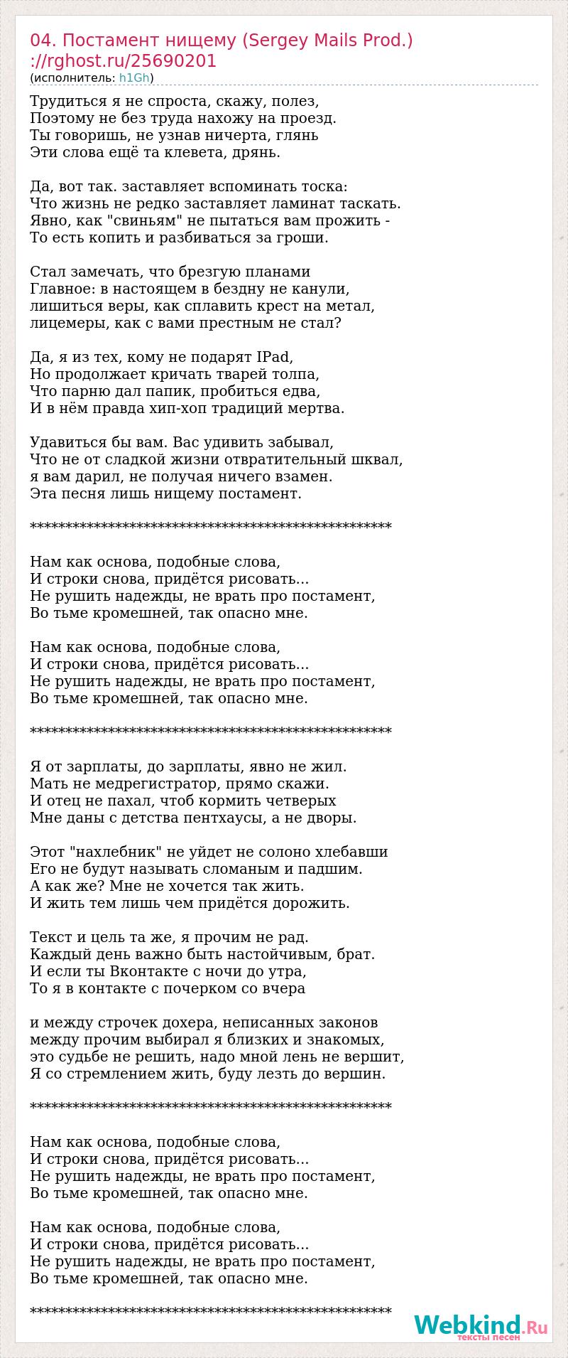 Трудиться я не спроста, скажу, полез, Поэтому не без труда нахожу на проезд. Ты говоришь, не узнав ничерта, глянь Эти слова ещё та клевета, дрянь. Да, вот так. заставляет вспоминать тоска: Что жизнь не редко заставляет ламинат таскать. Явно, как "свиньям" не пытаться вам прожить - То есть копить и разбиваться за гроши. Стал замечать, что брезгую планами Главное: в настоящем в бездну не канули, лишиться веры, как сплавить крест на метал, лицемеры, как с вами престным не стал? Да, я из тех, кому не подарят IPad, Но продолжает кричать тварей толпа, Что парню дал папик, пробиться едва, И в нём правда хип-хоп традиций мертва. Удавиться бы вам. Вас удивить забывал, Что не от сладкой жизни отвратительный шквал, я вам дарил, не получая ничего взамен. Эта песня лишь нищему постамент. *************************************************** Нам как основа, подобные слова, И строки снова, придётся рисовать... Не рушить надежды, не врать про постамент, Во тьме кромешней, так опасно мне. Нам как основа, подобные слова, И строки снова, придётся рисовать... Не рушить надежды, не врать про постамент, Во тьме кромешней, так опасно мне. *************************************************** Я от зарплаты, до зарплаты, явно не жил. Мать не медрегистратор, прямо скажи. И отец не пахал, чтоб кормить четверых Мне даны с детства пентхаусы, а не дворы. Этот "нахлебник" не уйдет не солоно хлебавши Его не будут называть сломаным и падшим. А как же? Мне не хочется так жить. И жить тем лишь чем придётся дорожить. Текст и цель та же, я прочим не рад. Каждый день важно быть настойчивым, брат. И если ты Вконтакте с ночи до утра, То я в контакте с почерком со вчера и между строчек дохера, неписанных законов между прочим выбирал я близких и знакомых, это судьбе не решить, надо мной лень не вершит, Я со стремлением жить, буду лезть до вершин. *************************************************** Нам как основа, подобные слова, И строки снова, придётся рисовать... Не рушить надежды, не врать про постамент, Во тьме кромешней, так опасно мне. Нам как основа, подобные слова, И строки снова, придётся рисовать... Не рушить надежды, не врать про постамент, Во тьме кромешней, так опасно мне. ***************************************************