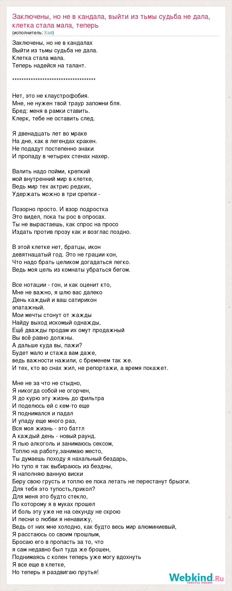 Заключены, но не в кандалах Выйти из тьмы судьба не дала. Клетка стала мала. Теперь надейся на талант. ************************************ Нет, это не клаустрофобия. Мне, не нужен твой траур запомни бля. Бред: меня в рамки ставить. Клерк, тебе не оставить след. Я двенадцать лет во мраке На дне, как в легендах кракен. Не подадут постепенно знаки И пропаду в четырех стенах нахер. Валить надо пойми, крепкий мой внутренний мир в клетке, Ведь мир тех актрис редких, Удержать можно в три срепки - Позорно просто. И взор подростка Это видел, пока ты рос в опросах. Ты не вырастаешь, как спрос на просо Издать против прозу как и возглас поздно. В этой клетке нет, братцы, икон девятнацатый год. Это не грации кон, Что надо брать целиком догадаться легко. Ведь моя цель из комнаты убраться бегом. Все нотации - гон, и как оценит кто, Мне не важно, я шлю вас далеко День каждый и ваш сатирикон эпатажный. Мои мечты стонут от жажды Найду выход искомый однажды, Ещё дважды продам их омут продажный Вы всё равно должны. А дальше куда вы, пажи? Будет мало и стажа вам даже, ведь важности нажили, с бременем так же. И тех, кто во снах жил, не репортажи, а время покажет. Мне не за что не стыдно, Я никогда собой не огорчен, Я до курю эту жизнь до фильтра И поделюсь ей с кем-то еще Я поднимался и падал И упаду еще много раз, Вся моя жизнь - это баттл А каждый день - новый раунд. Я пью алкоголь и занимаюсь сексом, Топлю на работу,занимаю место, Ты думаешь походу я нахальный бездарь, Но тупо я так выбираюсь из бездны, Я наполняю ванную виски Беру свою грусть и топлю ее пока летать не перестанут брызги. Для тебя это тупость,прикол? Для меня это будто стекло, По которому я в муках прошел И боль эту уже не на секунду не скрою И песни о любви я ненавижу, Ведь от них мне холодно, как будто весь мир алюминиевый, Я расстаюсь со своим прошлым, Бросаю его в пропасть за то, что я сам недавно был туда же брошен, Поднимаясь с колен теперь уже могу вдохнуть Я все еще в клетке, Но теперь я раздвигаю прутья!